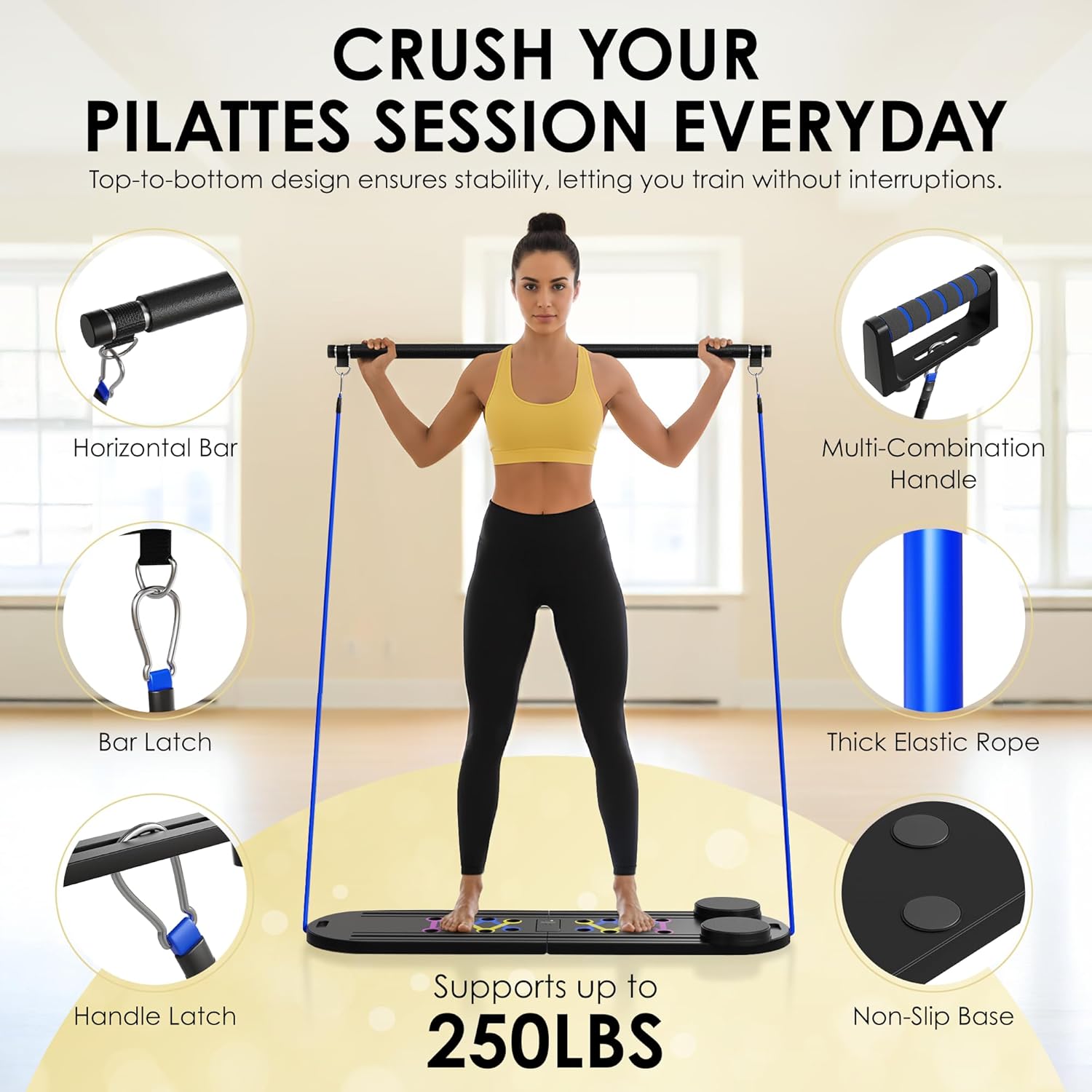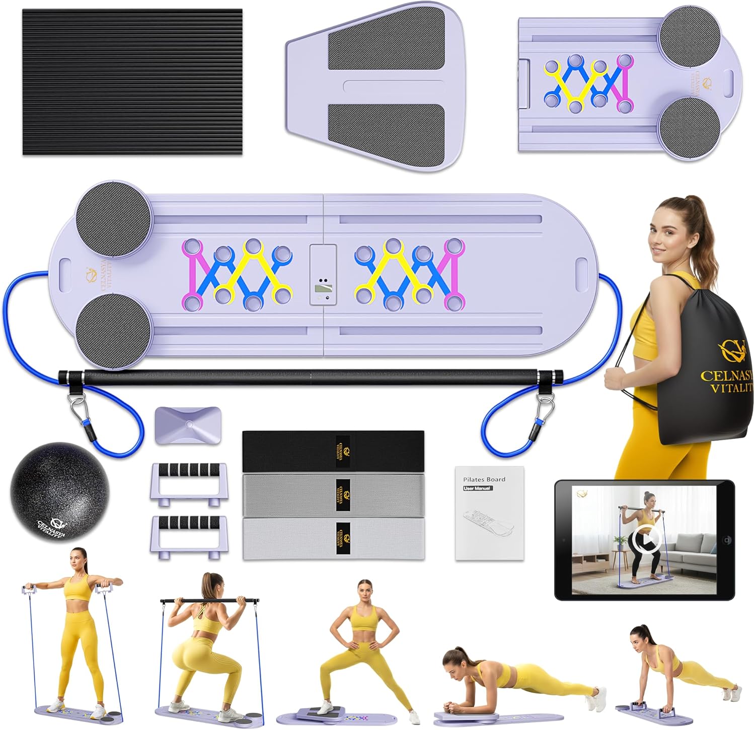 Introducing the Celnaysa Vitality Portable Pilates Reformer — a versatile fitness board that brings studio-quality Pilates into your home with convenience and style! If you’re a busy professional with no time to travel for classes, someone tired of paying high studio fees, or just want to stay consistent without leaving the house, our pilates at home equipment is your go-to. It transforms into 7 different exercise setups, letting you stretch, tone, and strengthen right in your living room. And don’t stress about where to begin! Unlike other pilates machine for home workout, we’ve included guided videos that meet you where you are, no matter your fitness level. Made with durable PP material, this pilates foldable reformer is designed to last and supports up to 250 lbs, giving you stability and confidence with every workout. With 3 knitted resistance bands included, you can switch between arm pulls, leg presses, and core-tightening moves to keep your body challenged. The Pilates ball adds a new dimension to balance and core training, while the foam mat ensures comfort and protection during every session. Once you’ve finished your session, just fold your multifuctional pilates slider board and slide it under your bed, sofa, or closet. Everything tucks neatly back into the travel bag we’ve provided, so you can even bring your mini reformer pilates machine outdoors—whether it’s the park, your yard, or even a friend’s house. Staying active has never been this easy to fit into your lifestyle. At Celnaysa Vitality, we believe fitness should fit around your life, not the other way around. That’s why we’ve created a reformer that saves you money, saves you time, and keeps you consistent—whether you’re chasing strength, flexibility, or overall wellness. Don’t wait to change how you move, feel, and live. Click ADD TO CART and bring studio-level Pilates into your home today!