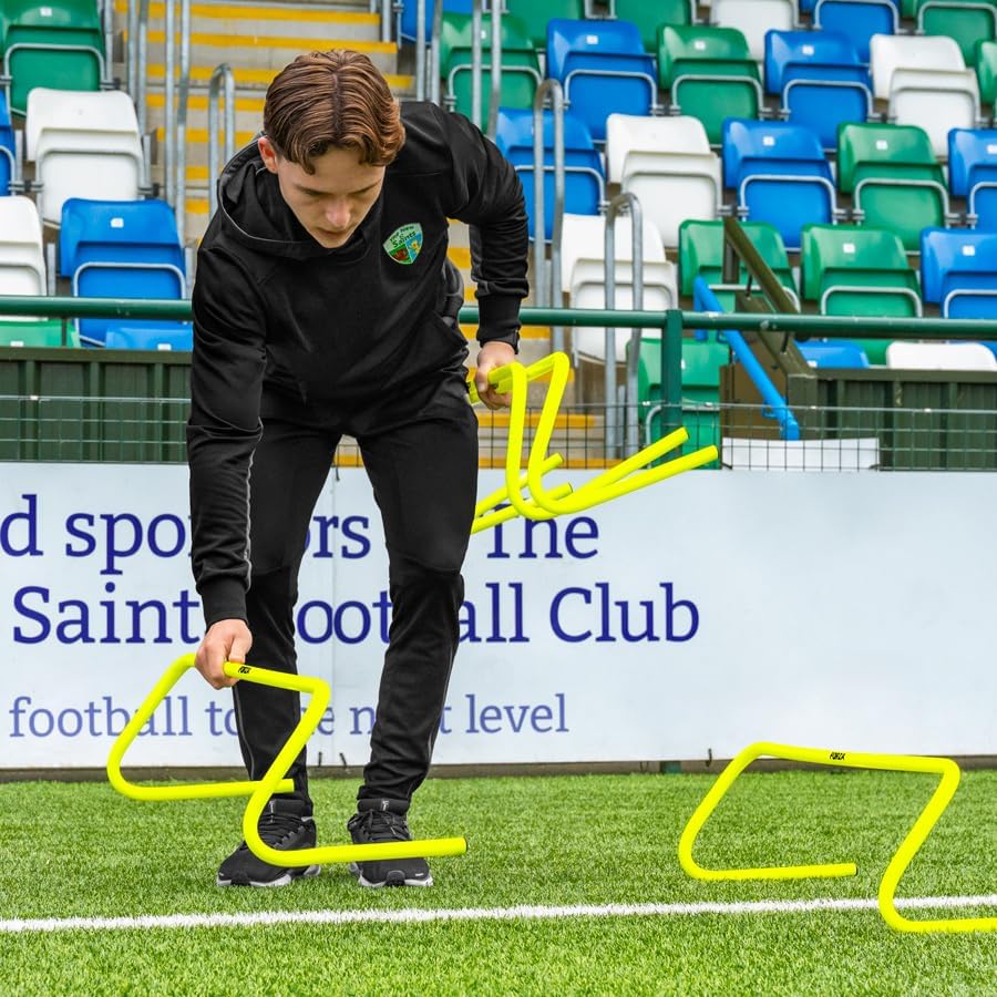 DIMENSIONSAvailable in 3x heights: 6in, 9in, 12in | 15cm, 23cm & 30cmHurdle Width: 34in | 86cmMATERIALSShatterproof plasticMISCELLANEOUSIdeal for coaches, schools and clubs looking to elevate their speed, agility & coordination sessionsAvailable in 3 heights to cater for different ability levels and add variety to drillsDesigned to fall forwards on impact to reduce injury risk