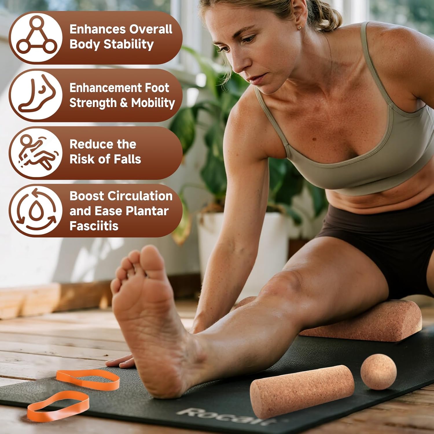 Rocalt Cork 4 In 1 Balance Board + 2 Pack Cork Yoga Blocks, Premium Cork Foot & Ankle Strengthener Kit, Half Moon Yoga Block & Calf Stretching