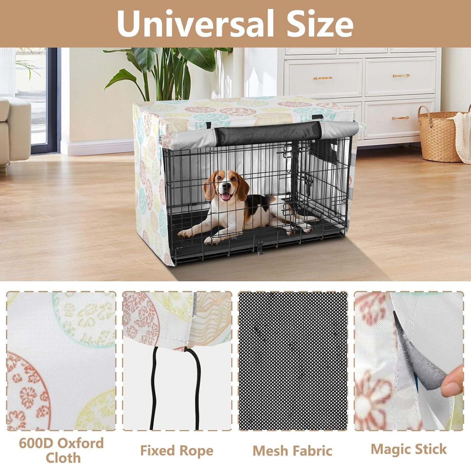 Protection – Made from 600D silver-coated oxford fabric, this dog kennel cover provides reliable protection against weather conditions, including wind and rain. It prevents your dog from scratching the crate and blocks harmful UV rays.Easy Installation – This pet kennel cover features a user-friendly fastening system, allowing for quick installation without tools. It securely attaches to your dog crate, ensuring it stays in place for continuous protection.Effective Ventilation – Mesh windows on every side of the crate cover allow for steady airflow, keeping your dog comfortable and well-ventilated while inside. This design ensures your pet has a cool and breathable environment.Secure Fit – Equipped with four tie-down straps, the cover stays firmly in place, preventing it from shifting or being blown away. This added stability makes it suitable for outdoor use even in windy conditions.Ideal for Multiple Uses – This versatile dog crate cover is Ideal for both indoor and travel use. Whether you’re at home, on a road trip, or camping, it offers a practical solution for protecting your pet’s crate.