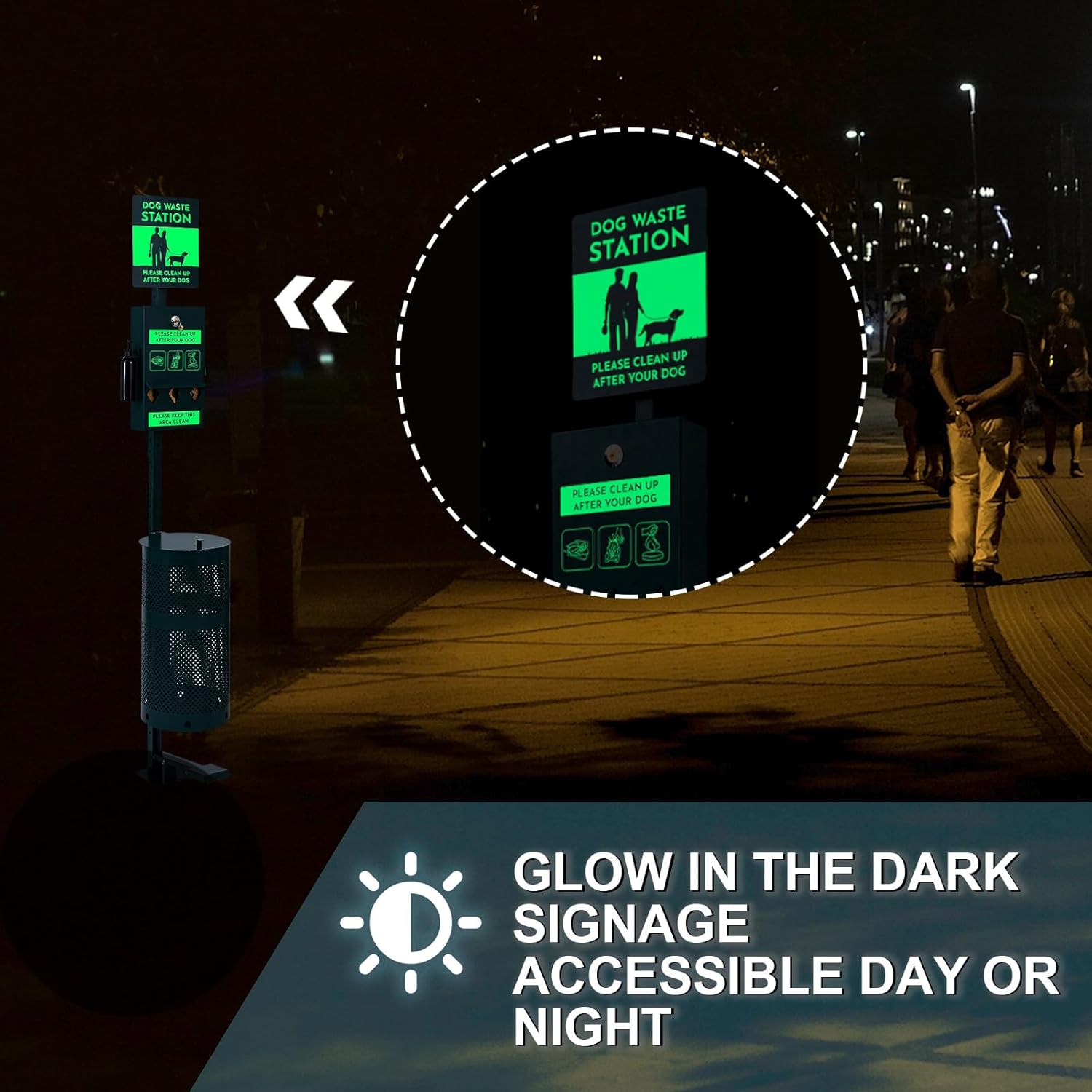| Included Components | 1 x Dog Poop Sign,1 x Bag Dispenser, 1 x Glow-in-the-Dark Dog Waste Station with Footrest, 1 x Hand Sanitizer Bottle, 1 x Outdoor Trash Can with Lid, 600 x Trash bags |