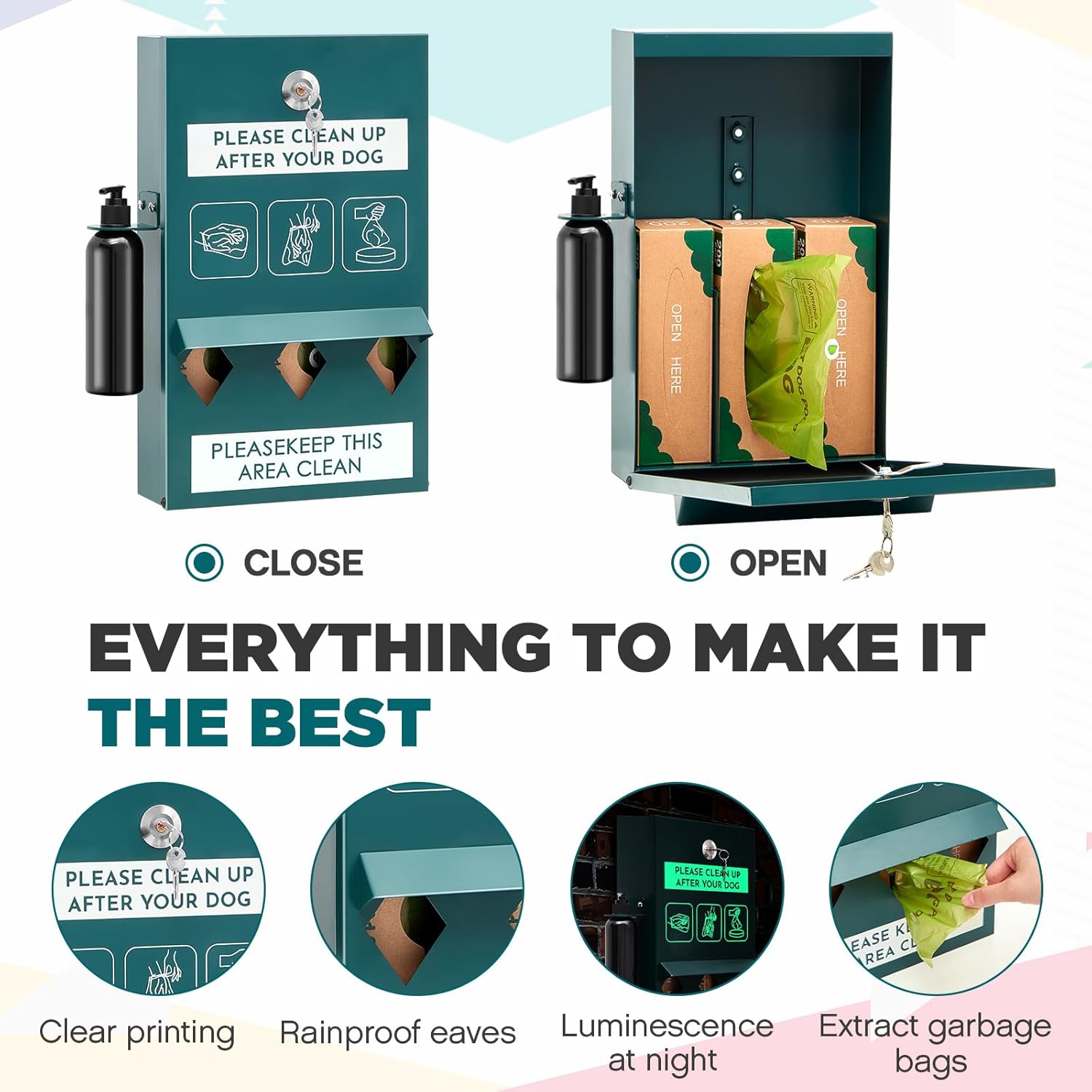Features: Easy installation: Engineered with good material, this outdoor dog trash station provides optimal durability and longevity, withstanding various weather conditions with ease. So, forget about continuously replacing worn-out stations. Once installed, our pet waste station is there to stay Practical design: Embrace sophistication and efficiency in pet waste management with our outdoor dog waste station! Designed with your convenience and your pet's hygiene in mind, this dog poop station outdoor changes the game in waste cleanup, providing you with a practical solution that redefines convenience in homes, commercial buildings, and parks alike Specifications: Size: 98.43 inches Color: green Material: Galvanized steel Package Includes: 600 x Trash bags 1 x Glow-in-the-Dark Dog Waste Station with Footrest 1 x Dog Poop Sign 1 x Bag Dispenser 1 x Hand Sanitizer Bottle 1 x Outdoor Trash Can with Lid Notes: Manual measurement, please allow slight errors on size The color may exist a slight difference due to different screen displays Small items are included, please keep them away from pets in case of choking risk. Before purchase, confirm whether the product size is suitable for your pet, and observe the pet's reaction when using. Please remove the product in time if there is any discomfort.