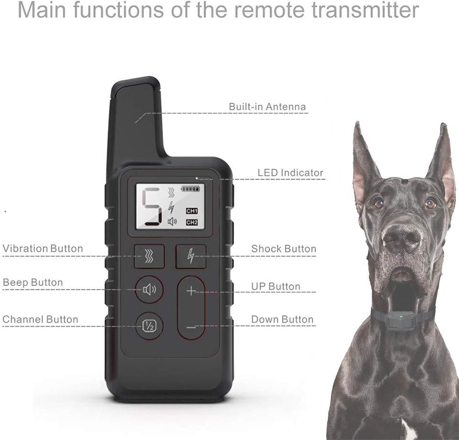 ??Thank you very much for browsing and purchasing. All the staff of our shop salute you! ?? Product Name: Dog Training Collar PACKAGE INCLUDED 1 x Collar Receiver 1 x Remote Transmitter 1 x Test Bulb 1 x USB cable 1 x Wrist Strap 1 x User Manual 1 x Collar Strap(Black) This completely waterproof electronic collar is very popular among dog trainers and pet owners. Its training system will help you control and train the dog within the effective range through a series of functions (including vibration alarm, sound warning, electrostatic punishment, etc.). Through its remote design, you can remotely stop barking, make corrections, and can easily call back, bite and fight. This will be your good training assistant. Wearing a bark arrester-matters needing attention 1. Please prevent the dog from biting the bark arrester. This product is composed of plastic stool electronics. If the dog swallows any part of this product, please consult your local veterinarian. 2. If the collar is worn too tightly or loosely, causing the contact point to rub against the skin for a long time, erythema may occur. After it disappears, adjust the appropriate tightness before using it. 3. If the dog has just put on the product and barked after being punished, it is because he does not understand what happened. It is recommended to stay away from the dog and wait until he understands what happened. 4. Usually the dog will greatly reduce barking after a few days of wearing it, but in fact the training is not over. Smart dogs will bark tentatively. Don't stop using it too early, otherwise the pre-training may be useless.