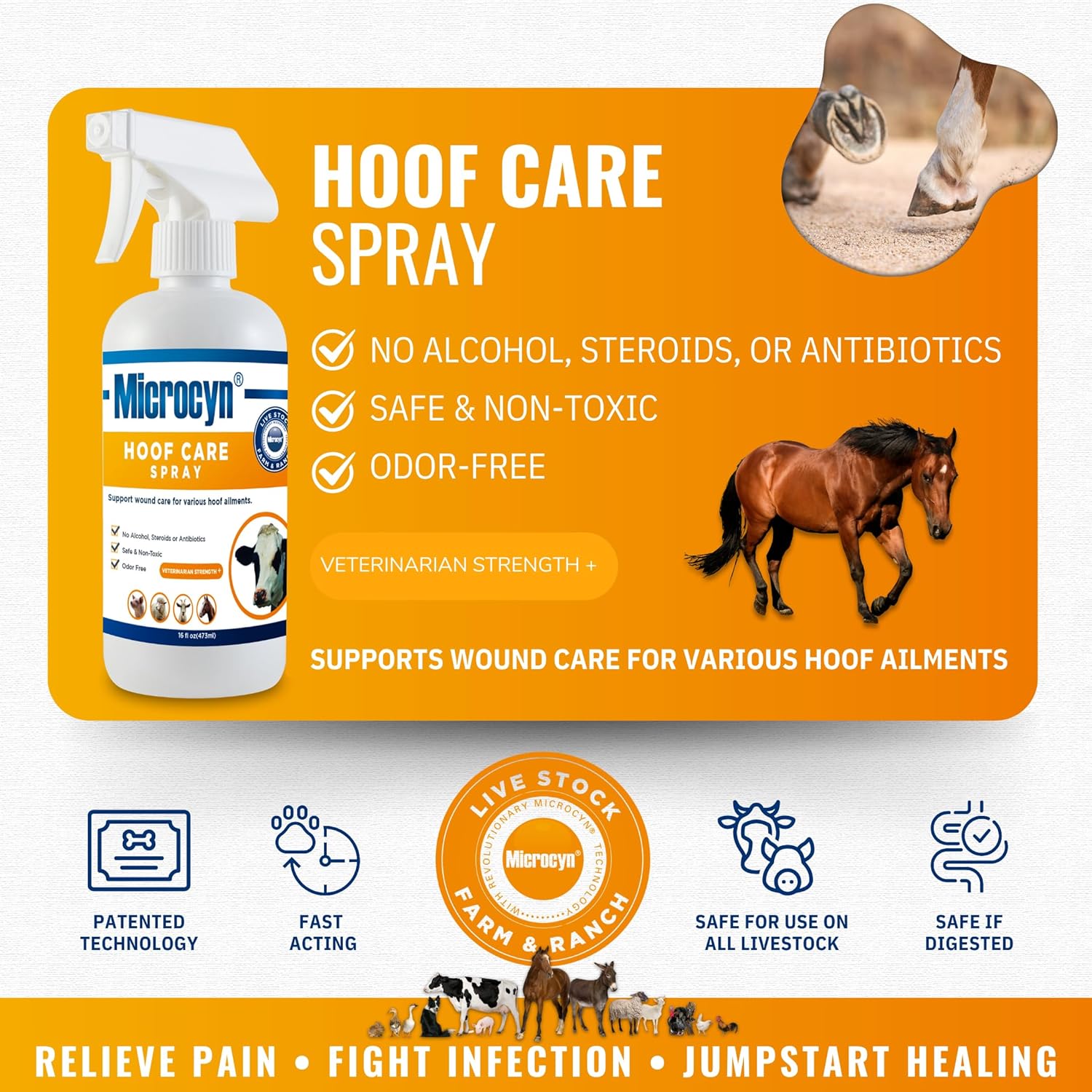 Maintain strong, healthy hooves with Microcyn Livestock Hoof Care Spray, a 16 oz hypochlorous (HOCl)-based solution designed to cleanse and support hoof condition in equines and farm animals. Hooves are constantly exposed to moisture, mud, debris, and environmental stress. This advanced formula is designed to help flush away buildup while supporting natural moisture balance and overall hoof integrity. Suitable for horses, ponies, donkeys, mules, and other livestock, the alcohol-free solution is gentle enough for daily use as part of routine hoof care programs. No rinsing is required, making it easy to integrate into barn and ranch management practices. Whether used as part of preventative hoof hygiene or alongside professional farrier care, this spray provides dependable support for maintaining hoof cleanliness and structure.