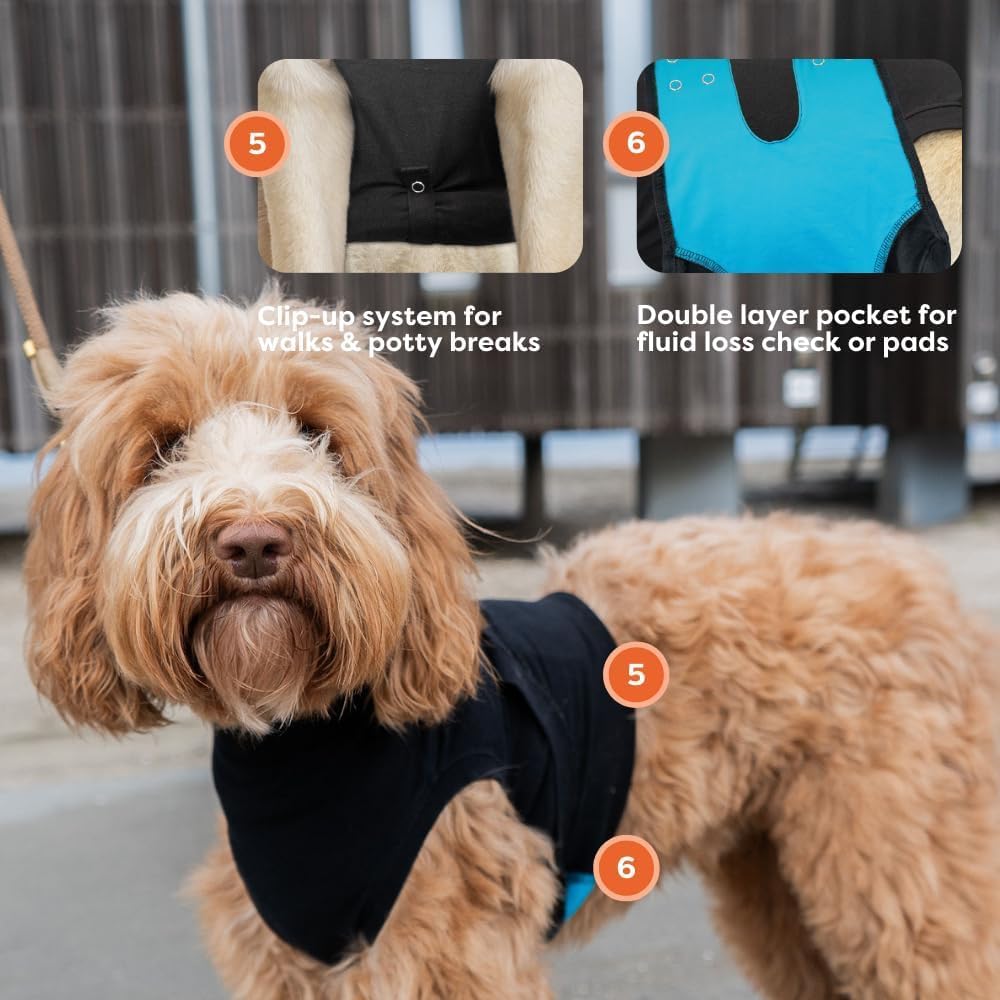 Suitical Recovery Suit for Dogs - 4XSmall Black - Dog Surgery Recovery Suit with Clip-Up System, Breathable Fabric for Spay, Neuter, Skin Conditions, Incontinence. Measurement 7.5-11.8 inches Neck-to-Tail. This dog surgery suit is made from 94% cotton and 6% lycra, which promotes better airflow.