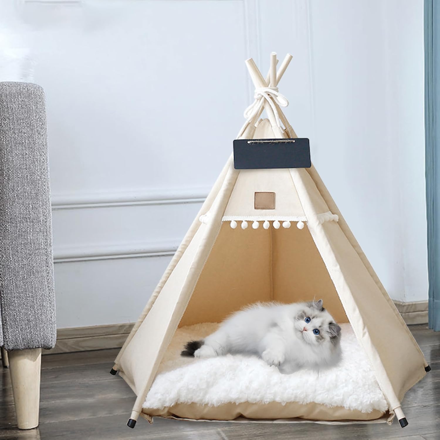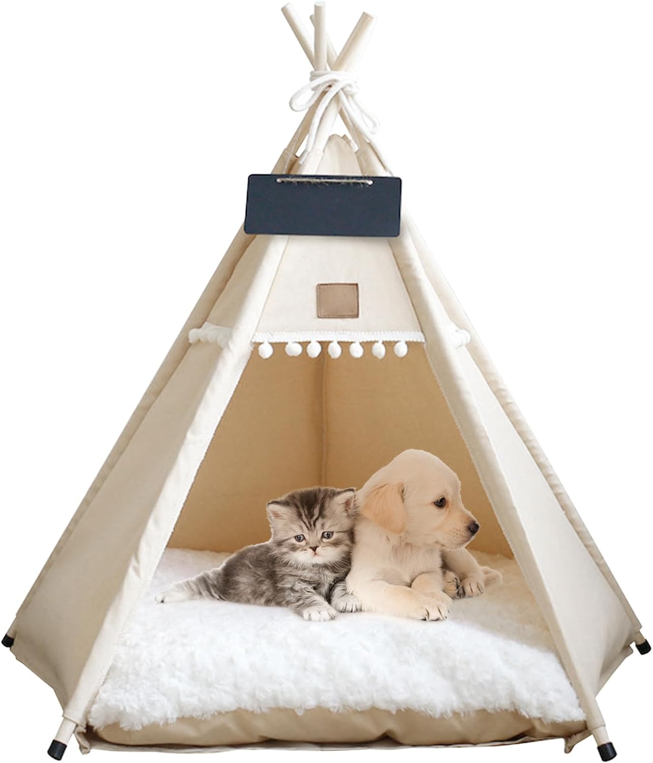 Description: The Dog & Cat Teepee is the perfect cozy hideaway for your furry friends! Crafted with the care and comfort in mind, this portable pet teepee a snug and secure retreat that your pets will adore. Cat Teepee is not only easy to set up but also easy to disassemble for convenient storage. Whether you're using it at home or on the go, this teepee hassle-free assembly and disassembly, ensuring your pet's comfort is always within reach. Our pets are cherished members of our families, and they deserve a warm and private place of their own. Give the of comfort and security to your beloved furry companions. Features:. Dog Teepee. -Color: Beige. -Material: canvas, wood. -Size: about M: 50x50x60 cm/19.69x19.69x23.62 inch., suitable for dog and cat under 7kg(about 15 pounds). Note: Manual measurement, please allow slight errors on size. The colors may exist slight difference due to different screens. Package Including 1 * Dog Teepee