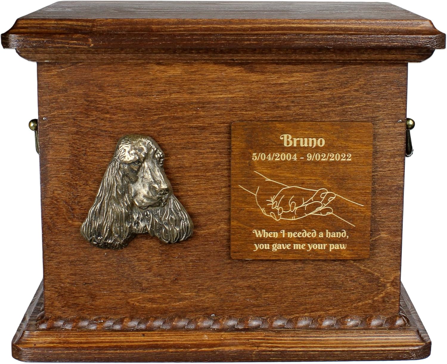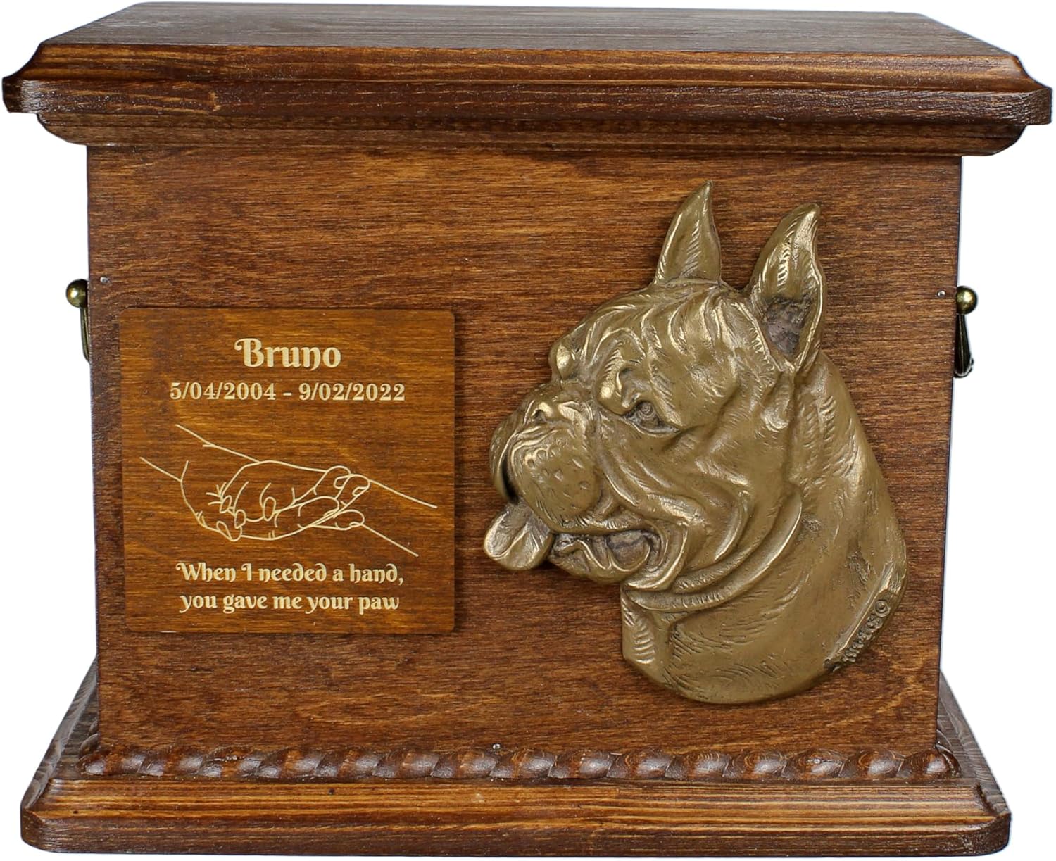 Introducing the Urn for Dog Ashes, a masterpiece in the Art-Dog Personalized Urns Collection. Handcrafted from durable birch plywood, this custom urn offers a solid and lasting memorial for your beloved pet's ashes. Personalize it with engraved details – your pet's name, dates of birth and death, and a heartfelt quote, creating a unique and meaningful tribute. Taking personalization to the next level, this urn features a cold cast bronze bust of a dog in relief. Meticulously crafted, the three-dimensional touch adds a lifelike essence to the memorial, capturing the unique spirit of your cherished pet. The sentence on the wooden plate can also be customized, ensuring a deeply personal touch. With a generous volume of 9.5 liters (600 cubic inches), this urn is suitable for larger pets, accommodating weights up to 95 kilograms (210 pounds). The ample space, coupled with the outside dimensions of 21 x 29 x 22 cm, ensures a dignified resting place, creating a timeless and elegant tribute.