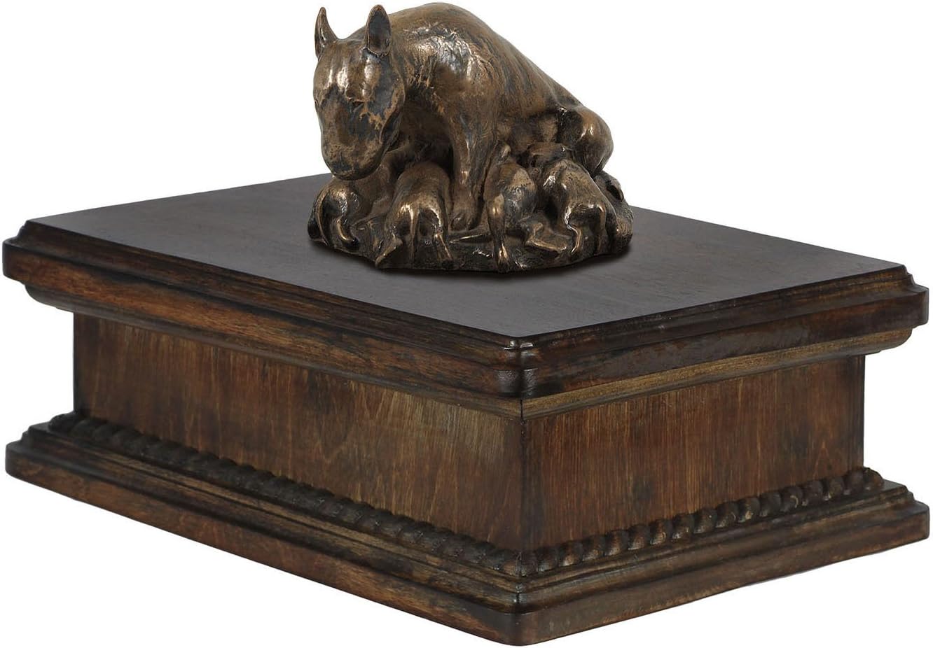 Handmade with precision and care, this urn stands as a testament to the enduring bond between you and your furry companion. Crafted from a solid birch wood base, this urn provides durability and longevity. The artistic touch comes to life with a choice of statues, including our exclusive Dog mama statue, symbolizing the nurturing love that transcends time. The statue is intricately crafted from Cold Cast Bronze, adding a touch of artistry to the memorial. Brass handles and wreath-shaped decorations embellish the urn, infusing an element of elegance. The removable lid enhances practicality, making it seamless to place your pet's ashes inside. This thoughtful design allows for ease of use during a difficult time, reflecting the deep love and respect you hold for your cherished companion. Measuring 21 x 29 x 22 cm, this urn provides ample space for your pet's ashes. Beyond its functional purpose, it becomes a timeless piece of art, radiating style and elegance. It is more than just a container; it's a dignified and personalized tribute that symbolizes the everlasting love and companionship you shared with your pet. Honor their memory with the Art-Dog Sitting Urn, where style meets sentimentality.