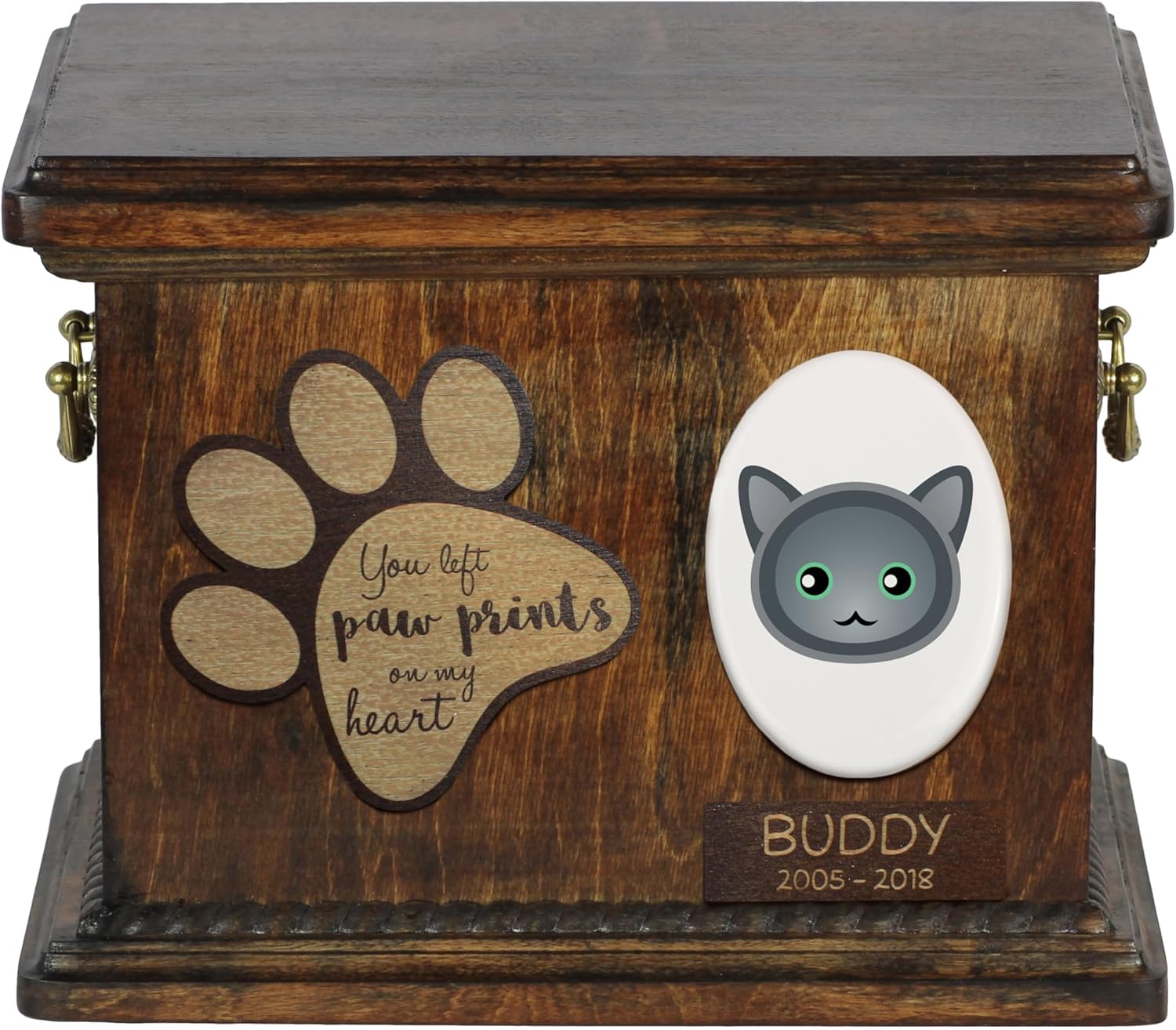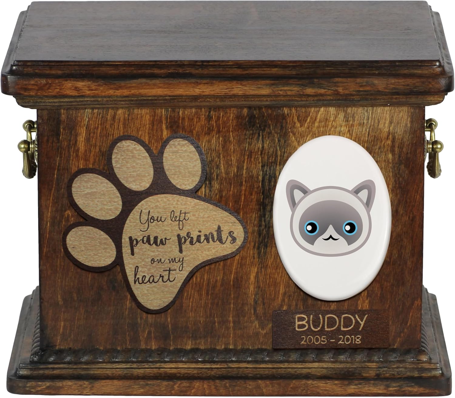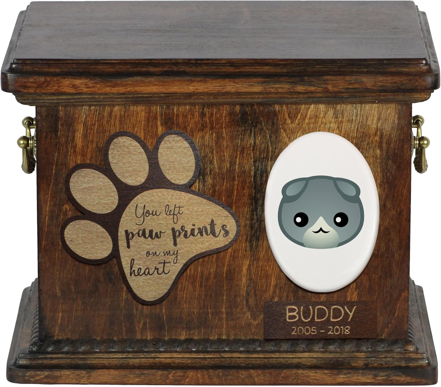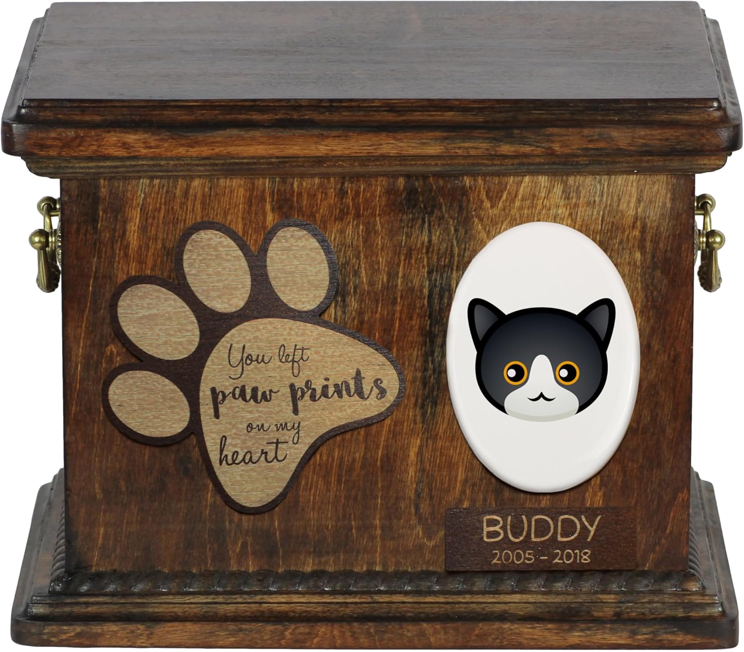 Honor your feline companion with our Custom Cat Memorial Urn, a beautiful piece from our Art Cat Urns Collection. Handmade with precision, this urn goes beyond a simple resting place; it is a personalized and elegant tribute to the bond you shared with your beloved cat. This urn offers a variety of geometric breeds to choose from, ensuring a personalized memorial that depicts your cat's individuality. Brass handles and wreath-shaped decorations add a touch of sophistication, making this memorial a true work of art. Please contact us to change the photo on the ceramic plate and engrave a custom sentence, name, and dates, all included within the price of the urn.