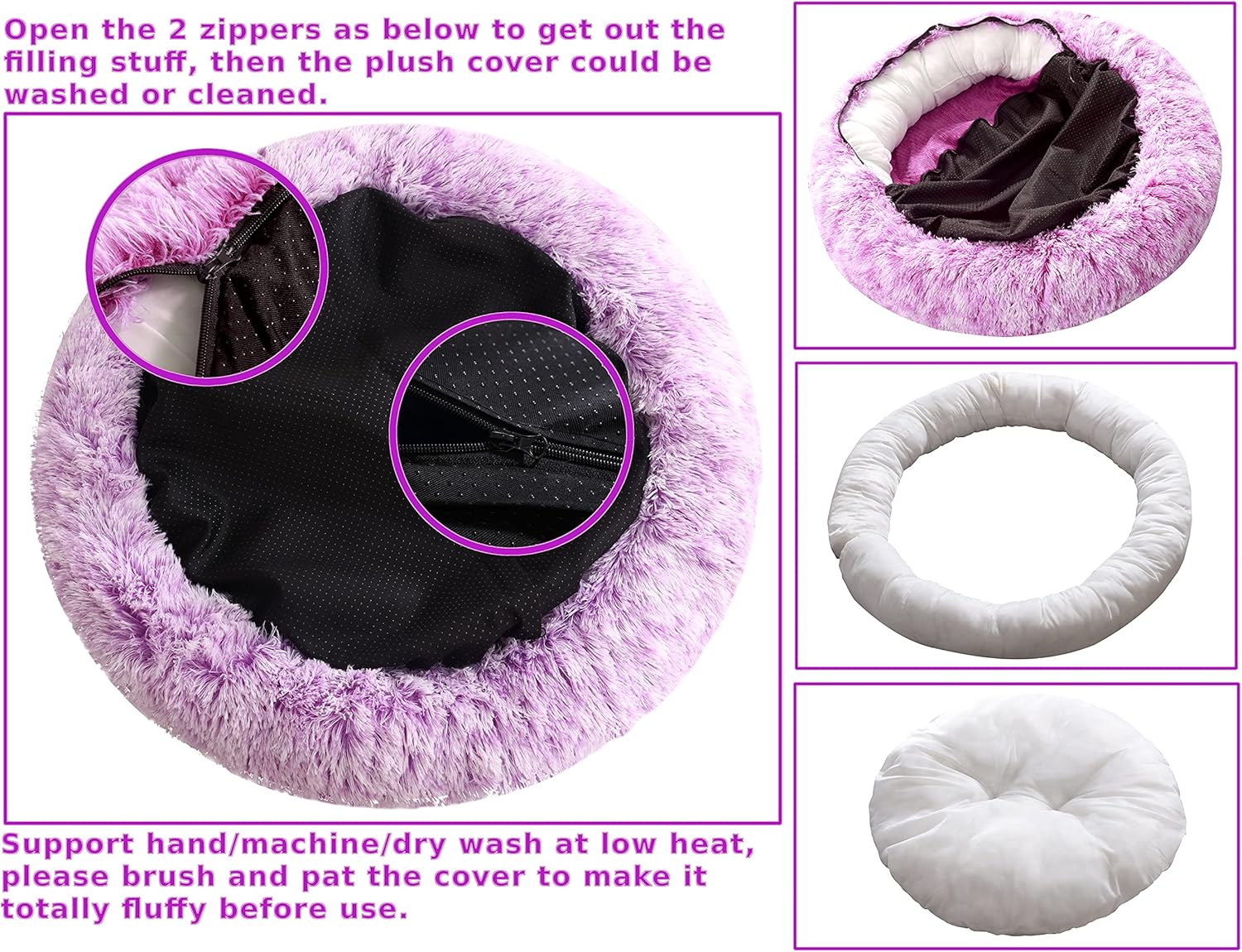 About Comlax Pet BedsNon-slip bottomWhen the dog or cat sleep in the donut cushion,the anti-slip can make sure the bed will not slide easily.Durable and comfortableOur pet beds with durable suture interface is stitched and reinforced by multiple procedures, so the fur will not fall off easily.And the soft material with raised rim provides head and neck support, while the super-soft filling can give your pet a good sleep.Easy to washThis detachable dog bed has a zipper. When you want to clean it, you can unzip the zipper and take out the soft filling inside. The outer cover can be washed in the washing machine or by hand, which is very convenient.First USEFor the convenience of storage and transportation, the package be vacuum compressed and packed. When unleasing the package, pls shake and vibrate the cushion/donut as much as possible to expand the filler enough. All the pictures shown are from real products, so pls trust the inflation/expansion rate of the filler.Give you convenience, give pet a home!Please come choose this bed quickly!