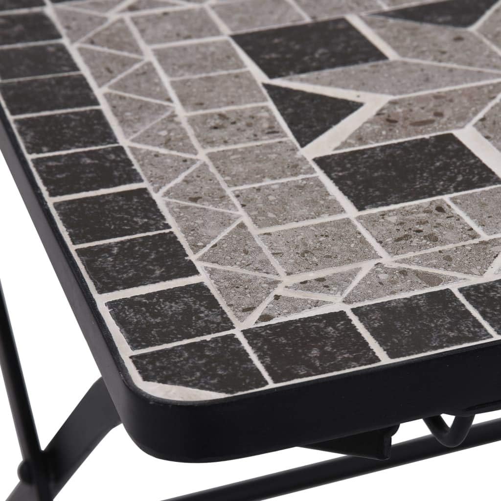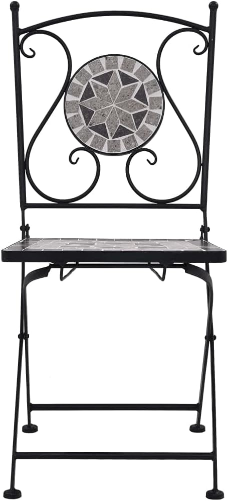 This set of mosaic chairs will make a decorative addition to your garden, patio, or balcony. It will be a pleasure to have a cuppa with your friends sitting on these chairs.Thanks to a strong powder-coated iron frame, this set is sturdy and durable. Due to the waterproof ceramic seat, these chairs are easy to clean. Delivery includes 2 chairs. Please note these chairs are not suitable to be left outside in cold condition.Color: GrayMaterial: Powder-coated iron frame + ceramic seatDimensions: 20" x 15.4" x 33.9" (W x D x H)Seat size: 15" x 13.8" (W x D)Delivery includes 2 chairsNote: It is not suitable to be left outside in cold condition