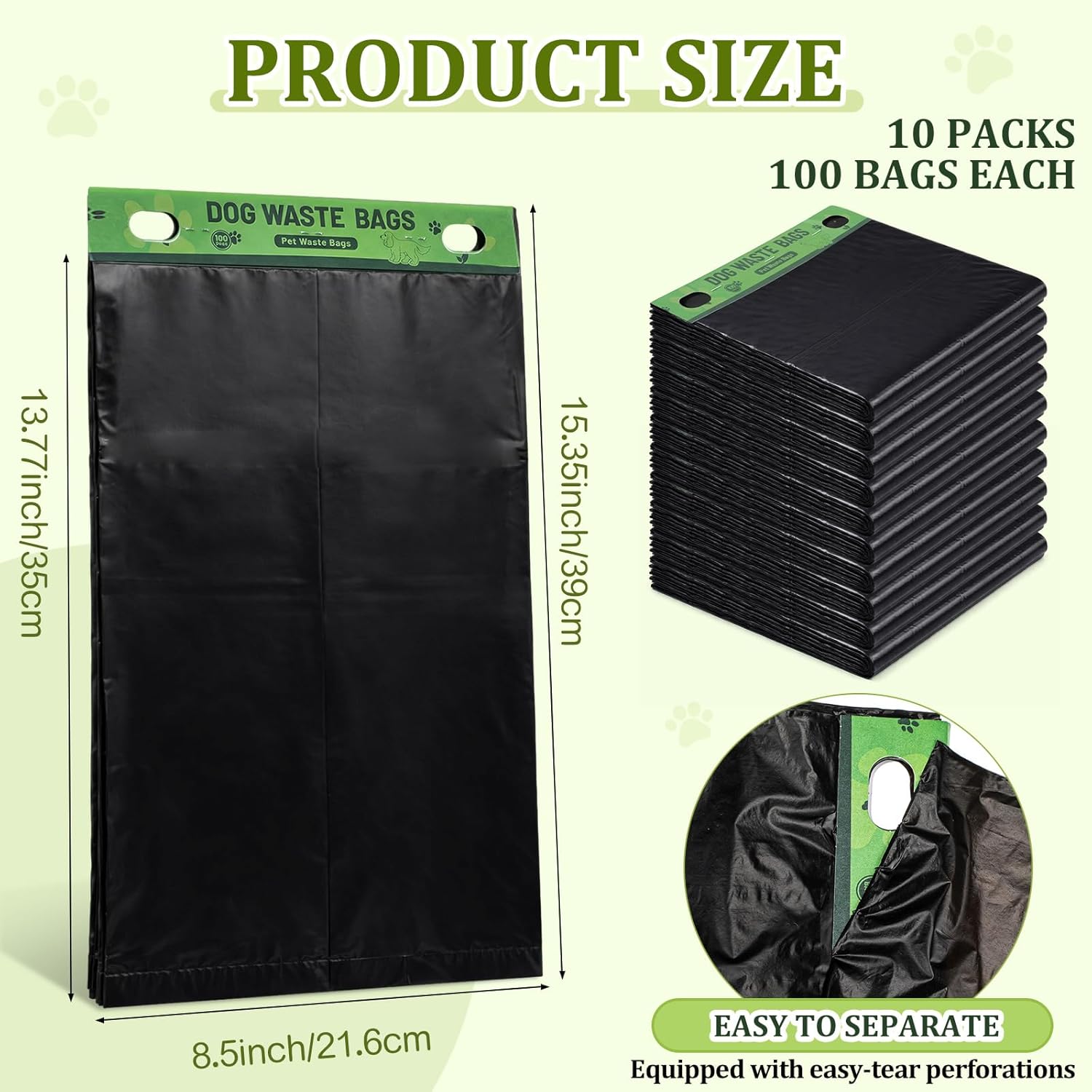Features: All Purpose Cleanup in One Complete Set: This dog waste bags header combo pack combines 1000 compact flat pack dog waste bags for daily walks with 100 oversized bags for larger cleanup tasks, allowing pet owners to handle everything from routine outings to backyard, kennel, or multi-dog waste without switching products or running short during busy schedules. Designed for Different Cleanup Scenarios: The smaller flat dog waste bags header offer convenient carry and controlled dispensing for walks and travel, while the large 26 x 33 inch roll xxx provide wider coverage for big dogs, yard waste, litter cleanup, or trash lining, giving flexibility and efficiency across home, outdoor, and professional pet care environments. Specifications: Material: hDPE, cardboard Color: black Size: Bag: 8.5 x 13.78 inches/ 21.6 x 35 cm, 26 x 33 inches/ 66 x 83.82 cm Header: 1.5 inches wide Package includes: 1100 x Dog waste station bag Notes: Manual measurement, please allow slight errors on size. The color may exist a slight difference due to different screen displays
