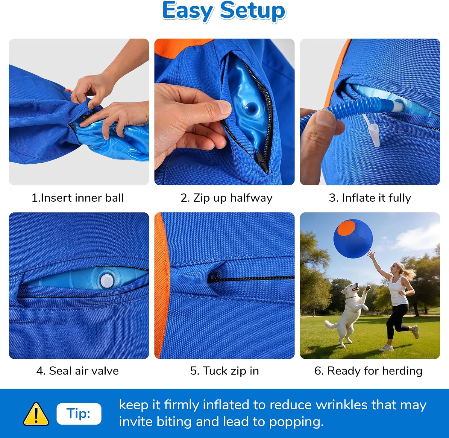 Option#2 for product description without A+ function Elevate your pup’s playtime with our premium herding ball for dogs—ultimate interactive toy for outdoor exercise, structured training and fun! Ideal for energetic dogs of all breeds & ages, it taps into natural herding instincts, curbs boredom/destructive behavior, and creates sweet bonding moments with your pet.Built for rugged outdoor use, this herding dog ball boasts a dual-layer impact-resistant construction: a premium elastic PVC inner layer for excellent bounce, and a 900D water-repellent Oxford outer layer with thick sewing thread & high stitch density for maximum durability. Reinforced stitching, a protective zipper garage and flaps minimize exposed edges to deter biting/tearing, while the heavy-duty build stands up to aggressive pushing, chasing and rough play—staying intact and safe for intense pup play sessions.Available in 18"/22" diameters – ideal for all herding/working dogs, active small/medium/large pups (Australian Shepherds, Border Collies, German Shepherds, Belgian Malinois, and all movement-challenge lovers). Also safe for equine, goat & livestock use in supervised pastures. Featuring dog-optimized, pet-safe colors (classic blue, vibrant blue-orange) – tailored to canine vision for maximum visibility and enhanced outdoor play engagement. Versatile outdoor design for dog training, agility drills, farm/ranch play & open-yard activities – turn any outdoor space into a fun, purposeful play and training zone! Coming with an inflator pump, 2 extra stoppers and a stopper remover for quick setup and easy maintenance. Effortless cleaning: hose off directly or remove the detachable outer cover for machine washing – perfect for grass, dirt and pasture messes!The interactive ball toys for herding dogs are ideal for dog owners, trainers, farm and ranch families, and working dog handlers looking for a durable dog toy that supports exercise, training, and enrichment. More than just a toy, it is a training ball for dogs and horses that strengthens the bond between pets and owners through consistent, engaging activity.Special Features: Safety, Durable, Premium elastic, DetachableMaterial: PVC & Oxford fabricColor available: Classic blue and blue-orange combinationDimension: 18"( 450mm )Dia Weight: 705 GramsPackage included:Outer cover x1Inner ball x 1Inflating pump x 1Extra stoppers x 2Stopper remover x 1User Manual x 1⚠️Important Safety Notes:1. NOT A CHEW TOY–Only for push-and-chase herding play—NOT suitable for Aggressive Chewers. Always supervise playtime, keep the ball fully inflated to minimize wrinkles that may entice biting and lead to popping. Remove the ball immediately if your dog chews on seams or closure areas!2. Store in a cool, shaded spot at all times. Direct sun exposure and high heat can cause the inner ball to overexpand, which may damage the outer cover and reduce long-term durability!3. Reinflate fully and firmly before each use!4. For added safety, Never allow unsupervised play between your dog and the Herding Buddy when children are present!