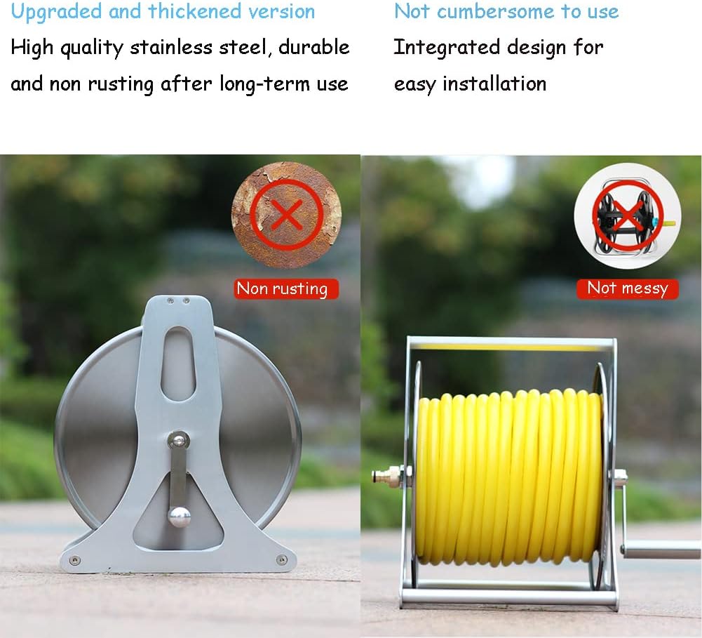 Product parameters:Material: stainless steelCommodity function: portable, wall hanging G1 Size: 27.5x20x43cm/10.8x7.9x17in /LxWxHG1 Net Weight: 3.3kg/ 7.3lbApplicable Water pipe length: 1/2" within 50 metersG2 Size: 27.5x30x36cm/ 10.8x11.8x14.2in/ LxWxHG2 Net Weight: 3.5kg/ 7.7lbApplicable Water pipe length: 1/2" within 50 metersG3 Size: 40x30x36cm/ 15.7x11.8x14.2in/ LxWxHG3 Net Weight: 3.9kg/ 8.6lbApplicable Water pipe length: 1/2" within 100 metersPackage Included:1* Water Hose Reel Without Hose1* Wall mounted accessoriesFeature:There is no place to put the water pipe truck, and it can also be hung on the wall with a wall hook.Metal material, cold-resistant sunscreen, stable pressureEquipped with a hand crank that makes it easy for you to organize the space-saving hose.Easy to store, just roll up the hose to make the dirty hose clean and tidy.360° reel, easy to operate smooth tube.Suitable for all hose types, can be used in the house, garden, street, farmland, lawns, parks, greenhouse.!!!The reel is supplied without hose enabling you to choose your own or add an existing garden hose.