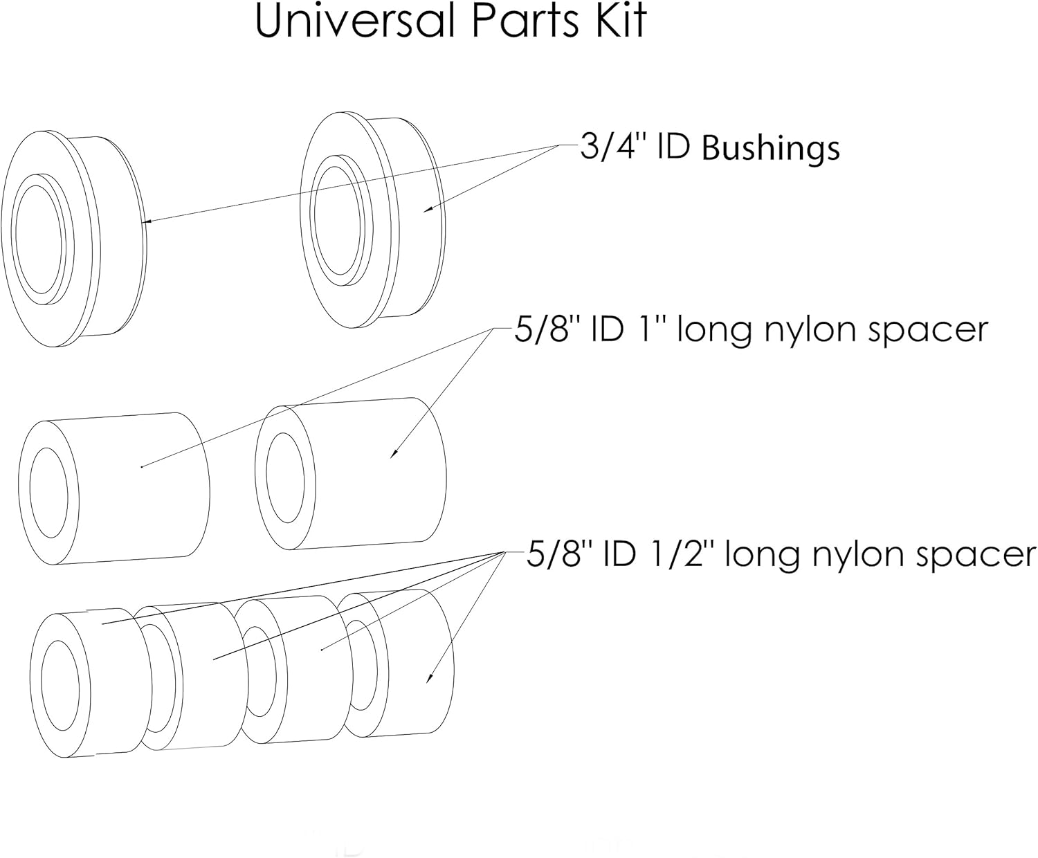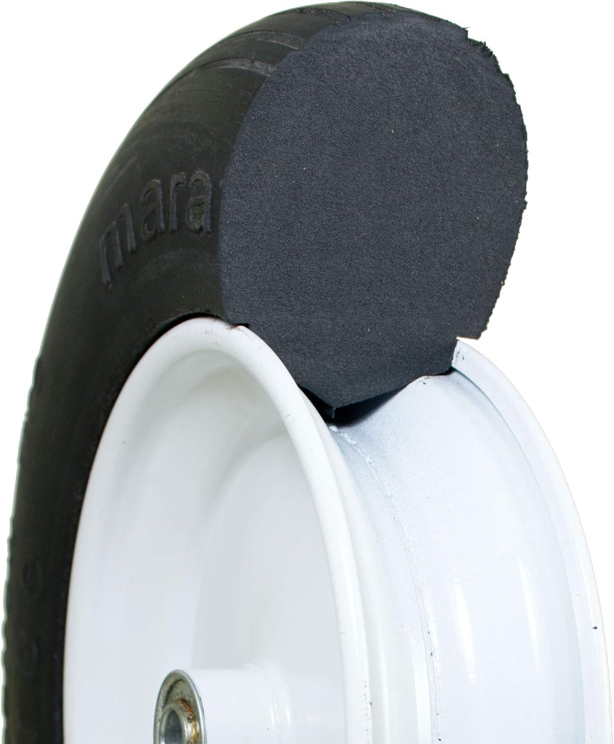 Product Description Eliminate downtime with the Marathon Universal Fit Flat Free Wheelbarrow Tire and Wheel Assembly. It is the perfect replacement for most wheelbarrows, including popular brands like Ames True Temper, Jackson, Seymour, Truper, United General, Yard Rover and more. The tire is 14.5" in diameter and can be used as a replacement for 13", 15" or 16" diameter tires. It is made of solid, polyurethane foam that has the same bounce and handling feel as an air-filled tire. It won't leave marks on any surfaces and will not deteriorate when left exposed to sun or moisture. Best of all, it’s guaranteed to never go flat. Tire markings and packaging may vary. The Marathon brand features a full line of air filled and flat free tire and wheel assemblies for lawn and garden and commercial/industrial equipment. This includes universal fit and exact match options to accommodate nearly every application. Count on Marathon for quality, easy-to-install products at a great value. From the Manufacturer Universal Fit Flat Free Wheelbarrow Tire is made of solid polyurethane foam. This tire replaces the following tire sizes: 3.50/2.50-8", 4.00-6", and 4.80/4.00-8". No flat tires have the same bounce, feel, cushion, and performance as pneumatic (air-filled) tires. They are also non-marking and will not be affected by Ozone or UV rays. Airless Tires are made of lightweight, solid polyurethane foam and are guaranteed to never go flat. Tire is 14.5" in diameter, comes standard with a 3" centered hub and 5/8" Ball Bearings. Includes adapter kit with additional bushings and spacers to fit your wheelbarrow - Adapter kit includes the following items: (4) - 1/2" Spacers, (2) - 1" Spacers, (2) - 3/4" Ball Bearings (5/8" installed)