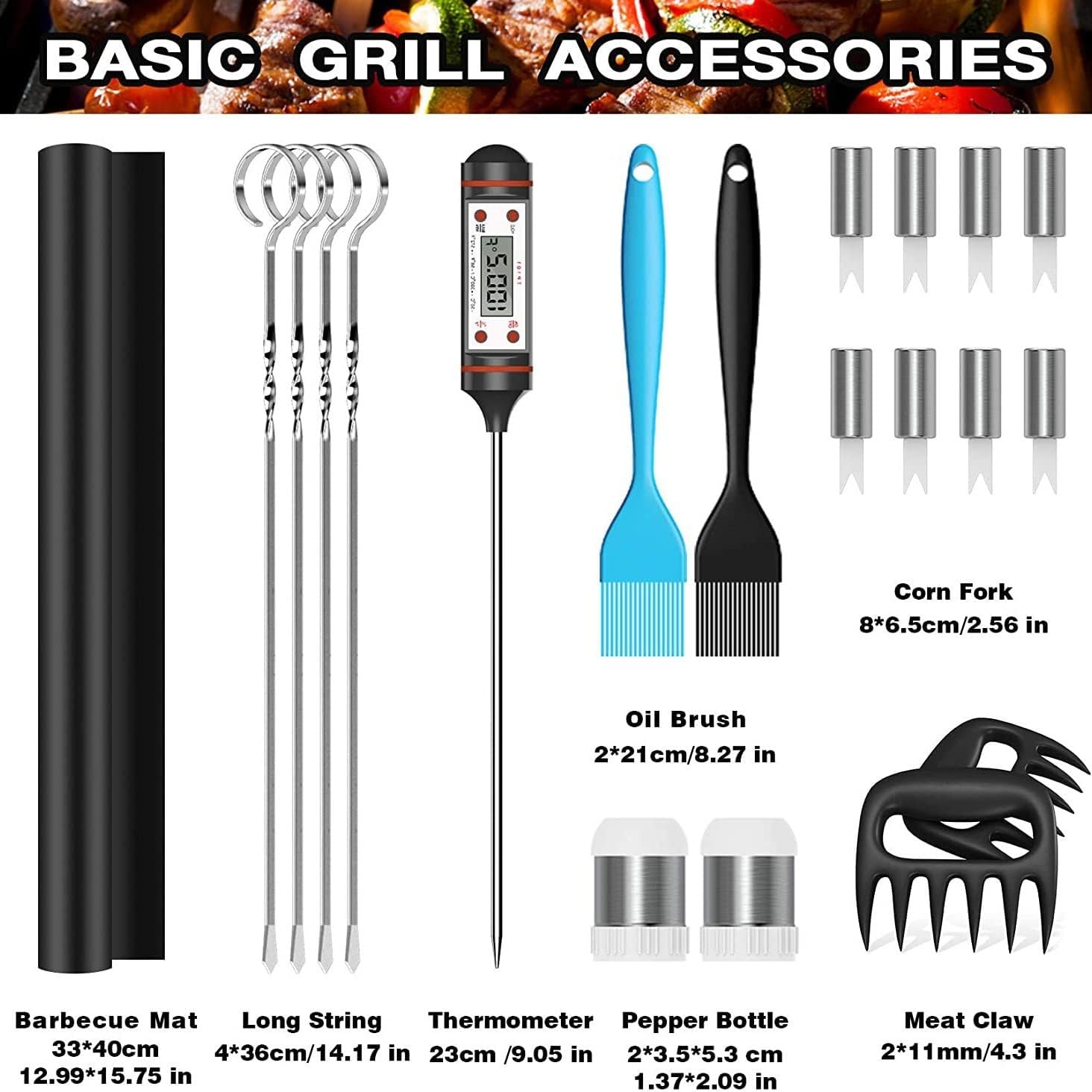 For grilling, grilling, kitchen cooking or outdoor kitchens. for backyard BBQs, tailgating, parties, picnics or camping with friends and family.The BBQ gift for your family and friends.Application: BBQ, picnic, party, camping and outdoor cooking etc.Versatile portable grill accessory kit.Material: Stainless steelSize: as photoAccessories:BBQ clip*1BBQ shovel*1BBQ fork*1Cleaning brush * 1Thermometer*1Twisted wire*4BBQ mat*1Silicone brush*2Meat*2Casters * 2Corn stick*8bag * 1Notice:1. Due to light and screen differences, the color of the product may be slightly different from the picture.2. Please allow 1-3cm difference due to manual measurement.All of our products offer a good user experience guarantee. You can fully trust to try our grill tools without any risks.