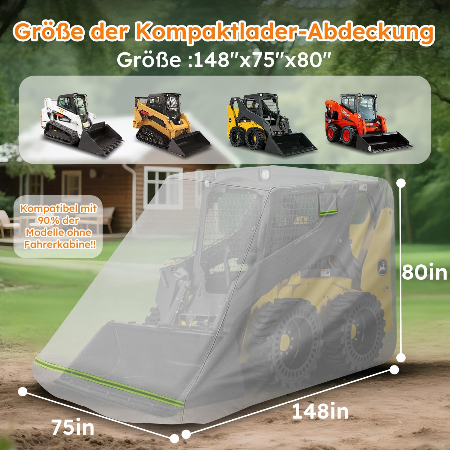 ⚠️ This skid steer cab cover is specially designed suitable for Cab Skid Steers. Fits 90% of non-cab models (Bobcat MT100, Kubota SCL1000, CASE TL100, etc.), skid steer cover waterproof’s elastic hem automatically adapts to uneven machine bodies. Please measure your mini skid steer before purchasing! Sudden heavy rain: Jump off the machine → cover with skid steer tarp → buckle up → done in less than 2 minutes. Outdoor test results:This steer loader cover’s interior humidity is 67% lower than traditional covers, completely preventing metal rust stains. This chinese skid steer cover is made of upgraded materials: waterproof DuPont Oxford fabric + inner padded cotton layer, scratch-resistant and impact-resistant, easily handling falling branches and accidental tool scrapes. Key Features 1. Windproof Buckle: Secure clip lock prevents skid steer cover from being blown away on windy days. 2. Elastic Hem: Fits snugly on uneven machines, mini skid steer loader cover stretches 20 times without deformation. 3. This mini skid steer weather cover has high-visibility reflective strips: Reflects twice as far at night, maximizing safety. Your mini skid steer loader deserves better protection! Order mini skid steer covers now to keep your equipment safe from weather damage and extend its lifespan!——mini skid steer attachments. ⚠️ Important Notes This mini skid steer cover is only suitable for skid steers with a cab. For skid steers without a cab, please choose the "" Standard version"" in our store (smaller size). Product Name: Skid Steer Cover (With-Cab Only) Color: Gray Material: Waterproof DuPont Oxford Size: 148"x75"x80" All-Season Use You get more than just mini skid steer cover: 1x Skid Steer Cover, 1x Storage Bag Suitable for mini skid steer skid steer mini skid steer attachments skidsteer mini loader mini skid skid steer accessories mini skid steer loader