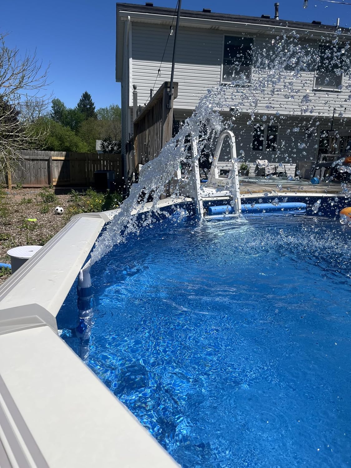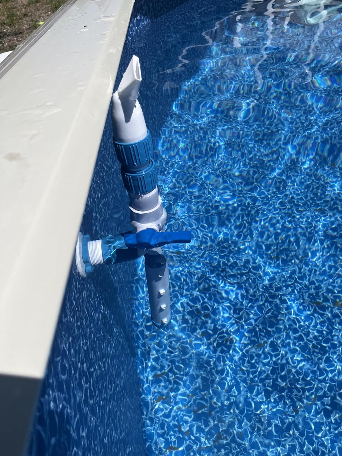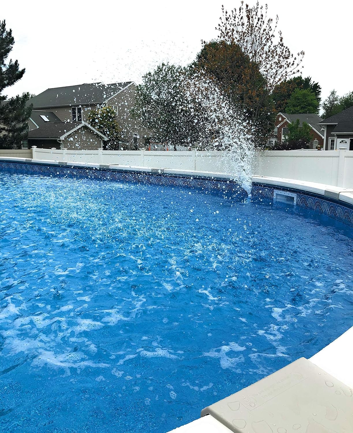 Swimming Pool Water Fountain Feature + Cleaner for Above/Inground Pools with 1.5" return fitting with mesh storage bag. Included ball valve for foutain height/shut off. new for 2025. water fountain fun while unique design to increase water circulation up to 10x makes super easy for cleaning and saving nearly 50% on chemicals to help keep your pool clear all season long. ability to cool or heat your swimming pool up or down 10 degrees