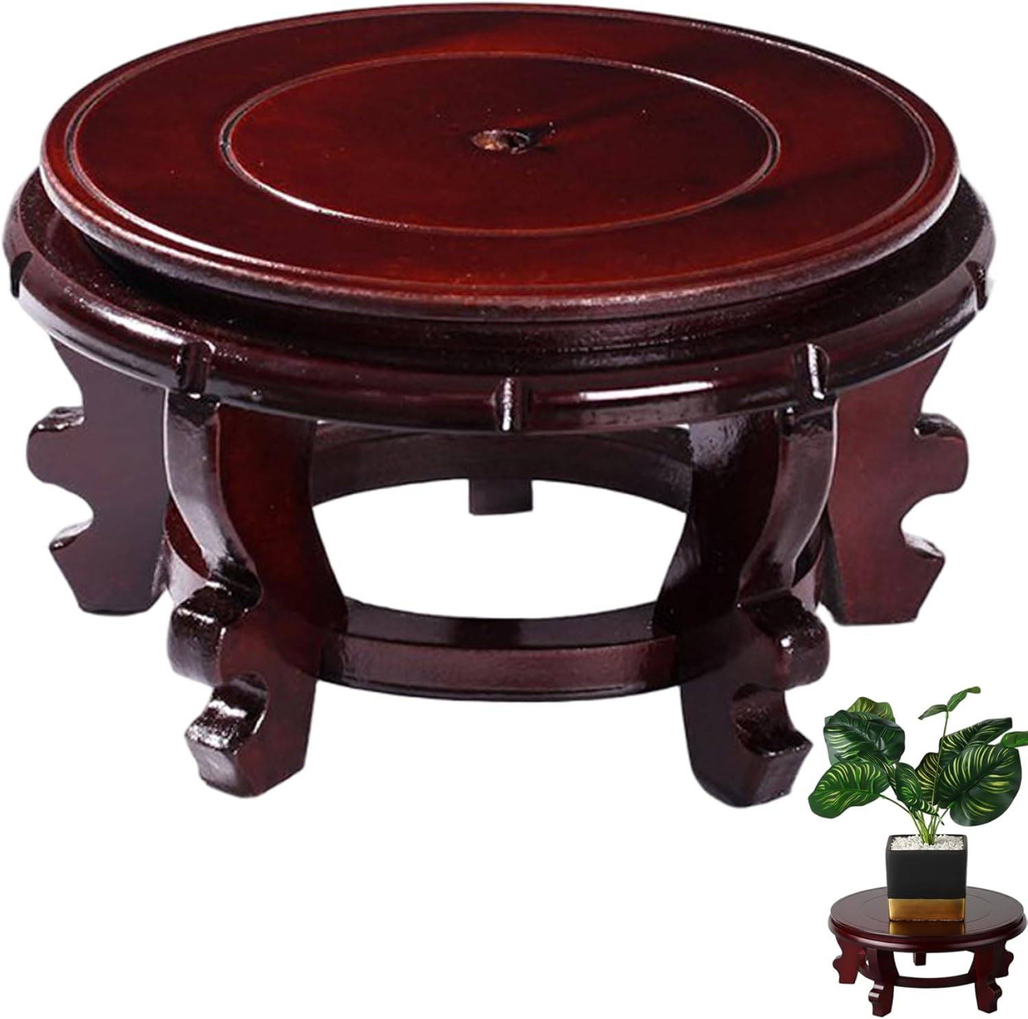 Description: The Oriental Plant Stand 12-Inch Vase Stand is a refined display solution designed to accentuate your indoor flower pots, fishbowls, or planter with a charming Asian-inspired aesthetic that effortlessly blends vintage and modern decor styles. Its sturdy construction supports pots up to 12 inches, ensuring stability and protection for your delicate plants or decorative vases. This versatile stand functions well as a table top plant stand or a floor base, providing multiple display options to suit your home's layout. Made from premium materials, it promises durability and resistance to everyday indoor wear, keeping your centerpiece elegant and intact. Additionally, the stand elevates your plants to enhance airflow and drainage, promoting healthier growth and vibrant foliage. Whether enhancing living room decor, creating a peaceful corner, or showcasing prized plants, this Oriental Plant Stand is a tasteful and practical addition to any home setting, blending function with cultural charm. Features:. Oriental Plant Stand. -Color: Brown. -Material: HDF. -Size: Diameter: 30 cm = 11.8 inch. Height: 14 cm = 5.5 inch. Note:Manual measurement, please allow slight errors on size.The colors may exist slight difference due to different screens. Package Including 1Pcs Oriental Plant Stand