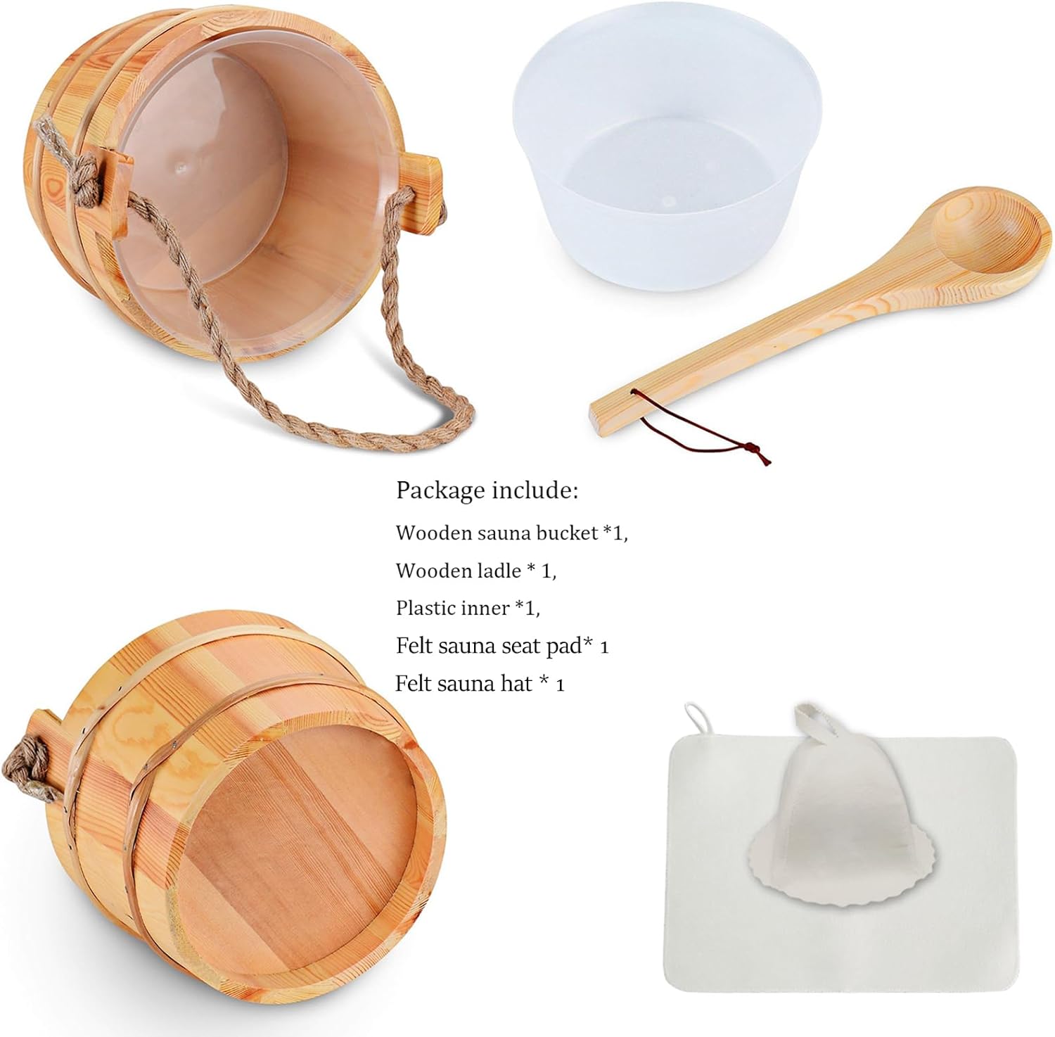 Packing included: 5L Finnish pine sauna bucket x 1 Plastic liner x 1 Finnish pine ladle x 1 Sauna seat pad x 1 Sauna hat x 1 As an essential Sauna accessory, This Beautifully crafted Wooden Sauna Bucket is your best choice! - Made of High Quality pine, with solid wood & exquisite texture. Having the right accessories is all part of your sauna and spa experience and the wooden bucket will be perfect for small and large saunas and SPA. - A form-fitting plastic insert holds the water but is nearly invisible when placed inside the bucket and compliments the well constructed wooden features of the bucket. - size: 6.7''(17cm) in height, 10.5''(26.5cm) in diameter, measuring 5 liter (1.3 gallon) of water. with a thick rope, easy to carry. - Hand-carved 15" long ladle allows you to easily scoop up the water from the bucket and pour over a hot sauna element without having to get too close, your safety in mind. It can also be used to pour water over your body to cool down the intense effect of the dry heat. Notes: 1.Keep it dry and put it in cool and ventilated place after using the bucket and ladle. 2.Due to different tone and texture, the actual item may slightly vary.