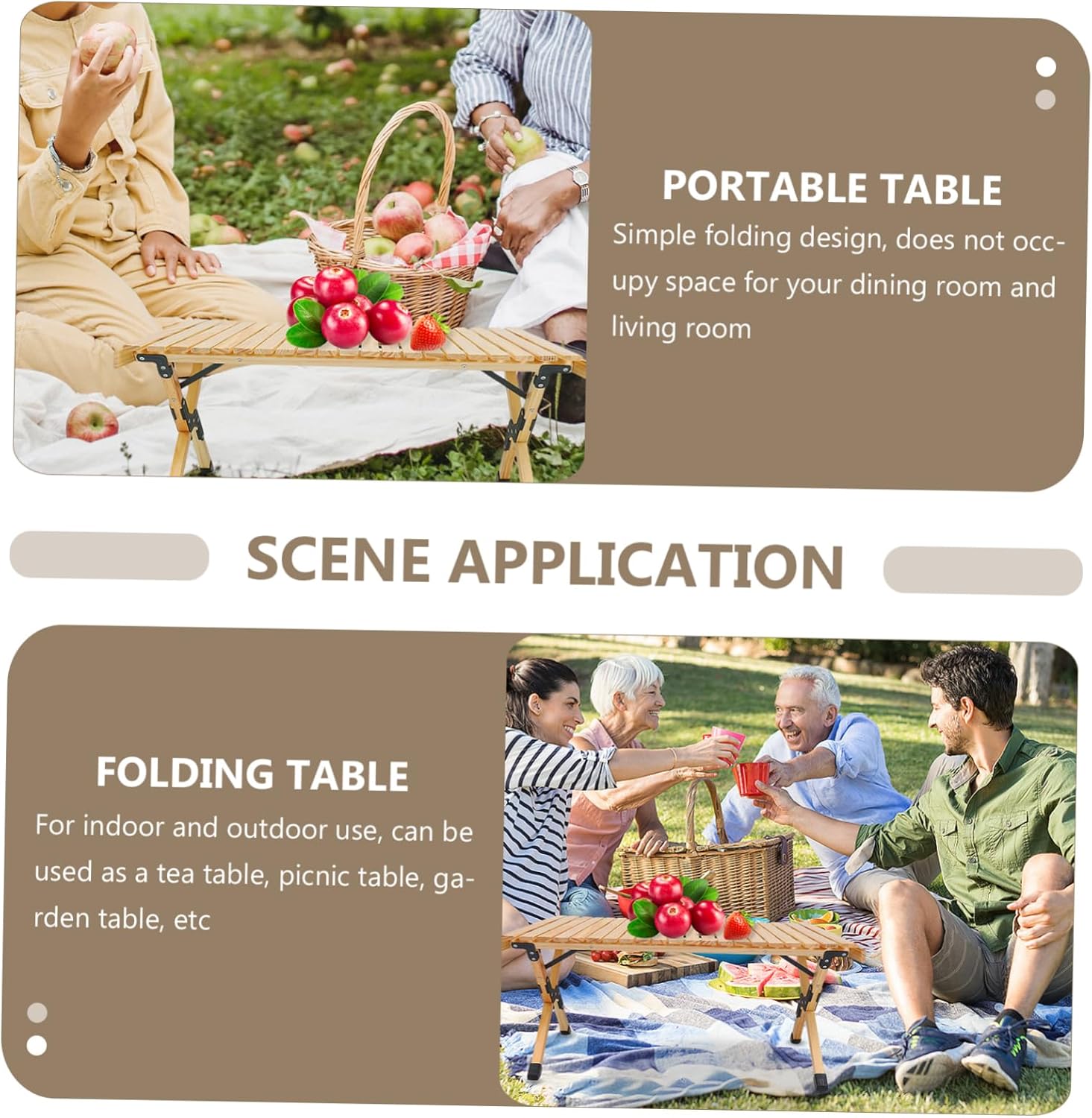 Package Include 1 x folding table Features - Material: Wood Folding Table. - Color: Beige Wooden Table. - Size: About 95.00X60.00X40.00cm/37.34X23.58X15.72in Folding Picnic Table. - The folding picnic table is perfect for a picnic, camp, travel, climb, BBQ and party, easy to carry for it is so portable and easy to fold up. Outdoor Supply. Home Furniture - makes the table wear-resistance and durable for a long time use Camping Desk. - The flat tabletop can be rolled up which is pretty simple and stylish. Wooden Folding Table - The folding camping table is made of solid natural wood, so durable and compact in daily use. Wooden Picnic Table - The wooden picnic table is with folding design, easy to carry, which can be carried and stored almost everywhere Folding Dinner Table.Goods InformationWooden Picnic Table With egg roll structure and folding design, it's easy to install in minutes and convenient to carry for compact storage or transport.Portable Table Perfect for camping, barbecues, picnics and backyard parties, beach, garden kitchen.Camping Desk This is an outdoor folding table