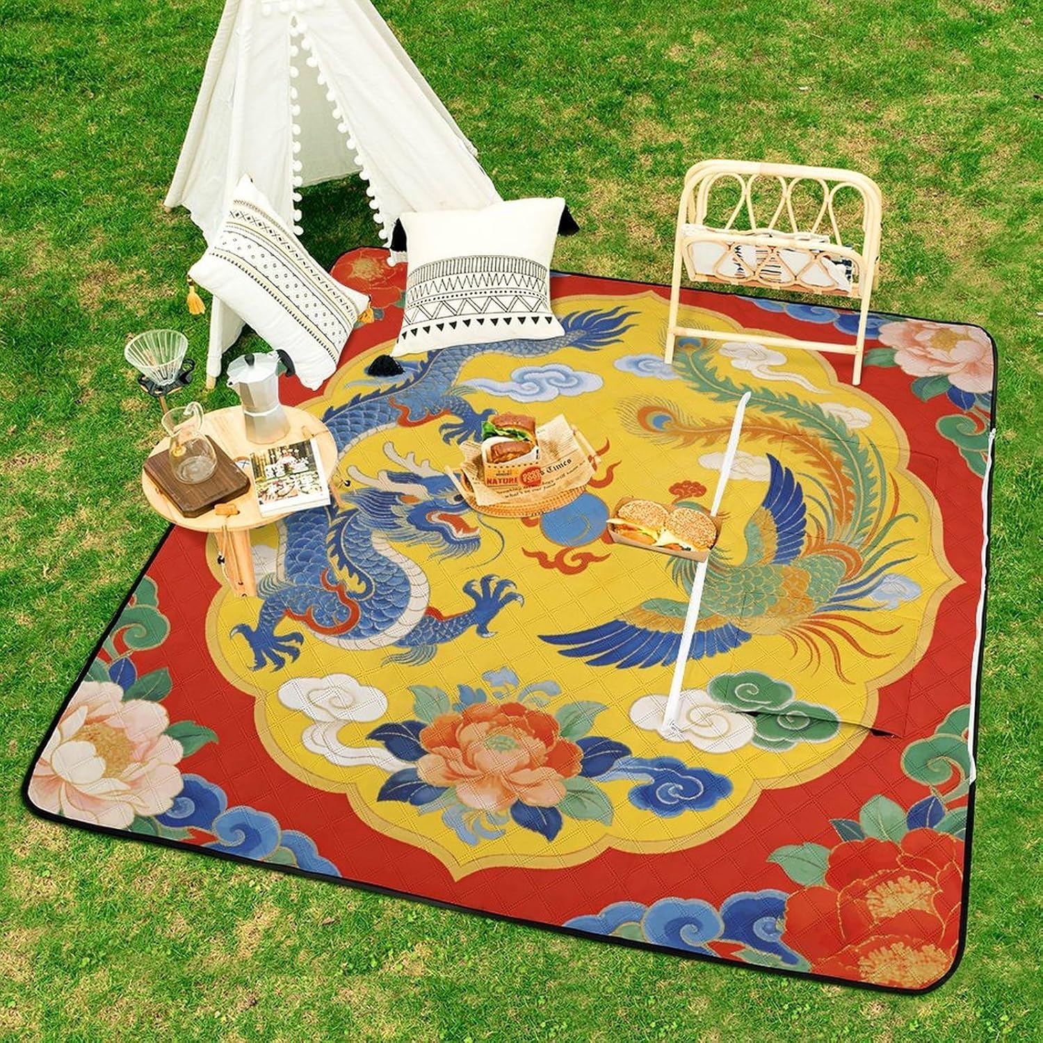 The picnic blanket ,we've only used the highest quality materials, so every picnic is an experience .The underside lining is very sturdy and therefore suitable for every surface. No more worrying about dirty or wet bottoms when you are sitting on damp grass. The The Dragon And Phoenix Bring Good Fortune blanket protects you from water, dust and dirt.A large capacity bag and a picnic blanket, 2in1. It has a large capacity and one bag can hold everything you need for going out. You choose the place you want to lie down, and this bag can be turned into a comfortable picnic blanket in seconds also it can fold into tote bag, which is waterproof, sand-proof and wear-resistant.Therefor,you can take it to nearby parks, campuses, beaches or lawn, anywhere you want to lie down.