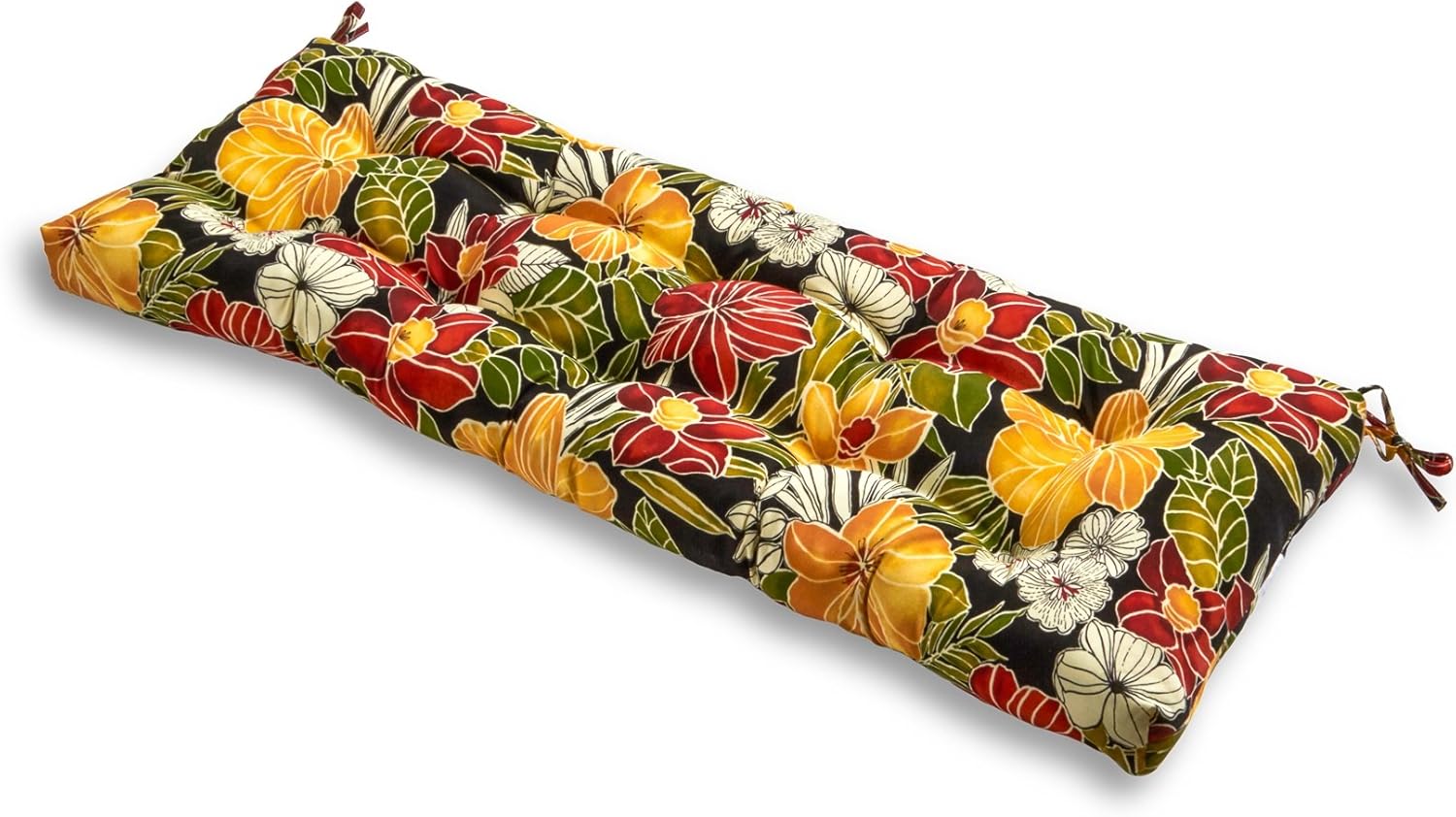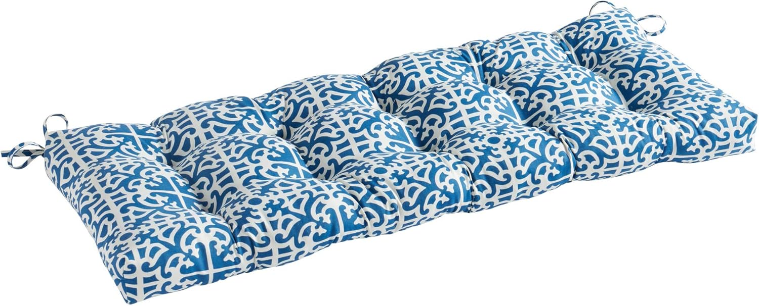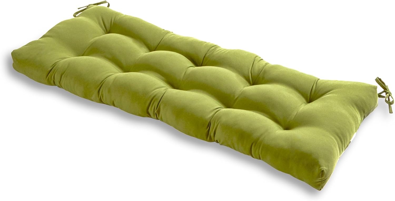 Add a touch of style and comfort to your outdoor furniture with this Greendale Home Fashions Outdoor Bench Cushion. This cushion measures 51" x 18" x 5", and features a durable 100% polyester fabric. The cushion's poly fiber fill is made from 100% recycled, post-consumer plastic bottles, and is overstuffed for added comfort, strength and durability. Cushions are circle tufted to prevent fill from shifting, and come with string ties to keep cushions securely fastened to your swing or bench. A variety of colors and prints are available to enhance your outdoor decor.Please measure your cushions before purchase to ensure a proper fit.Please Note: Cushion dimensions can be +/- 2 inches. Product will arrive in a slightly compressed state; please allow a few days for product to expand to final size listed in description.In an effort to reduce waste, your cushions will arrive in a recyclable box with no additional plastic waste.For best results, and to extend the life of your cushions we recommend storing them covered when not in use.