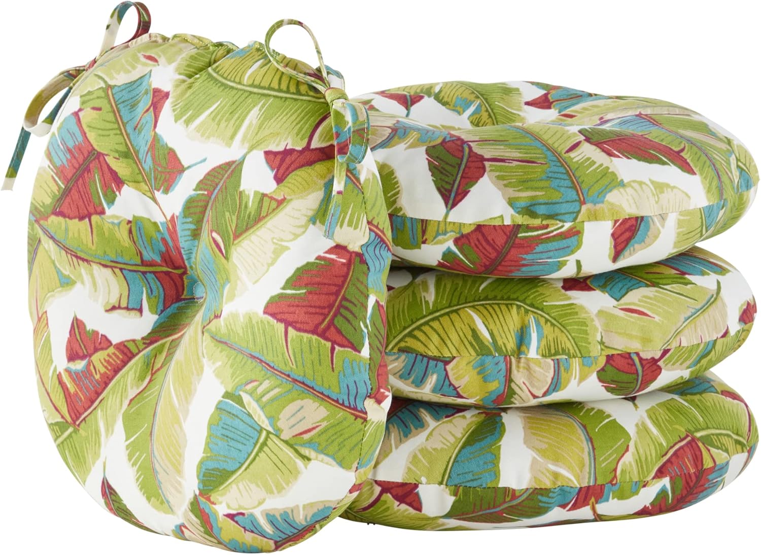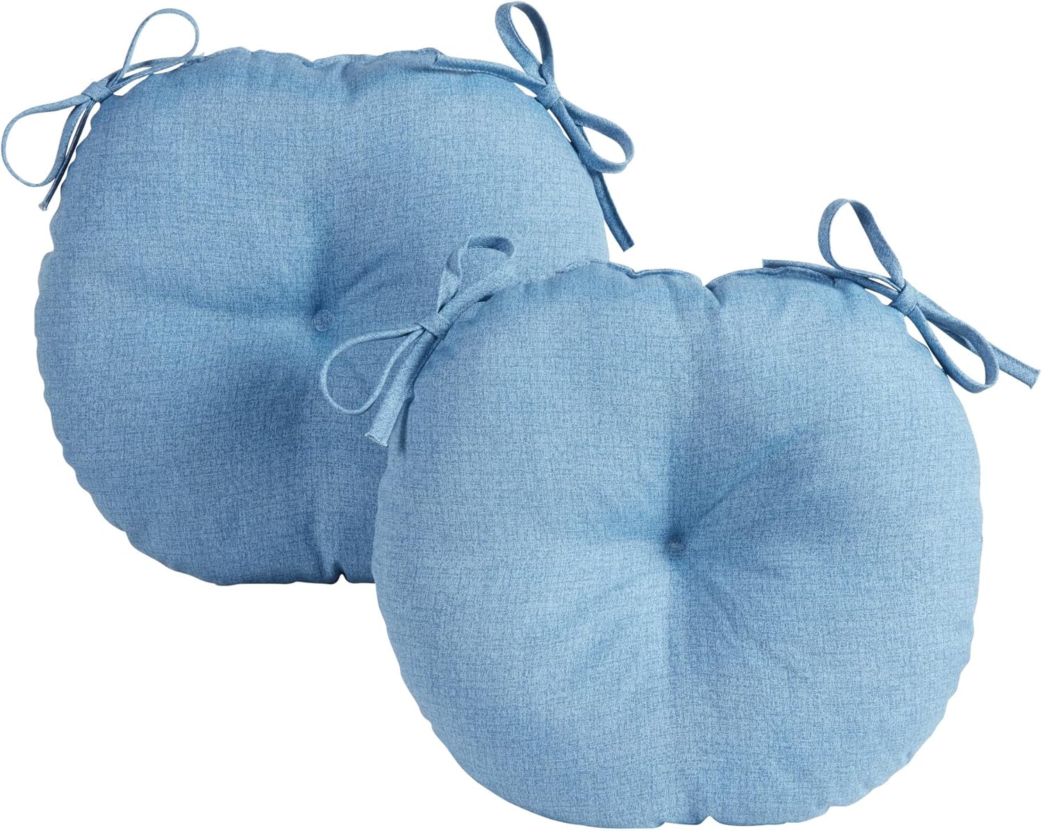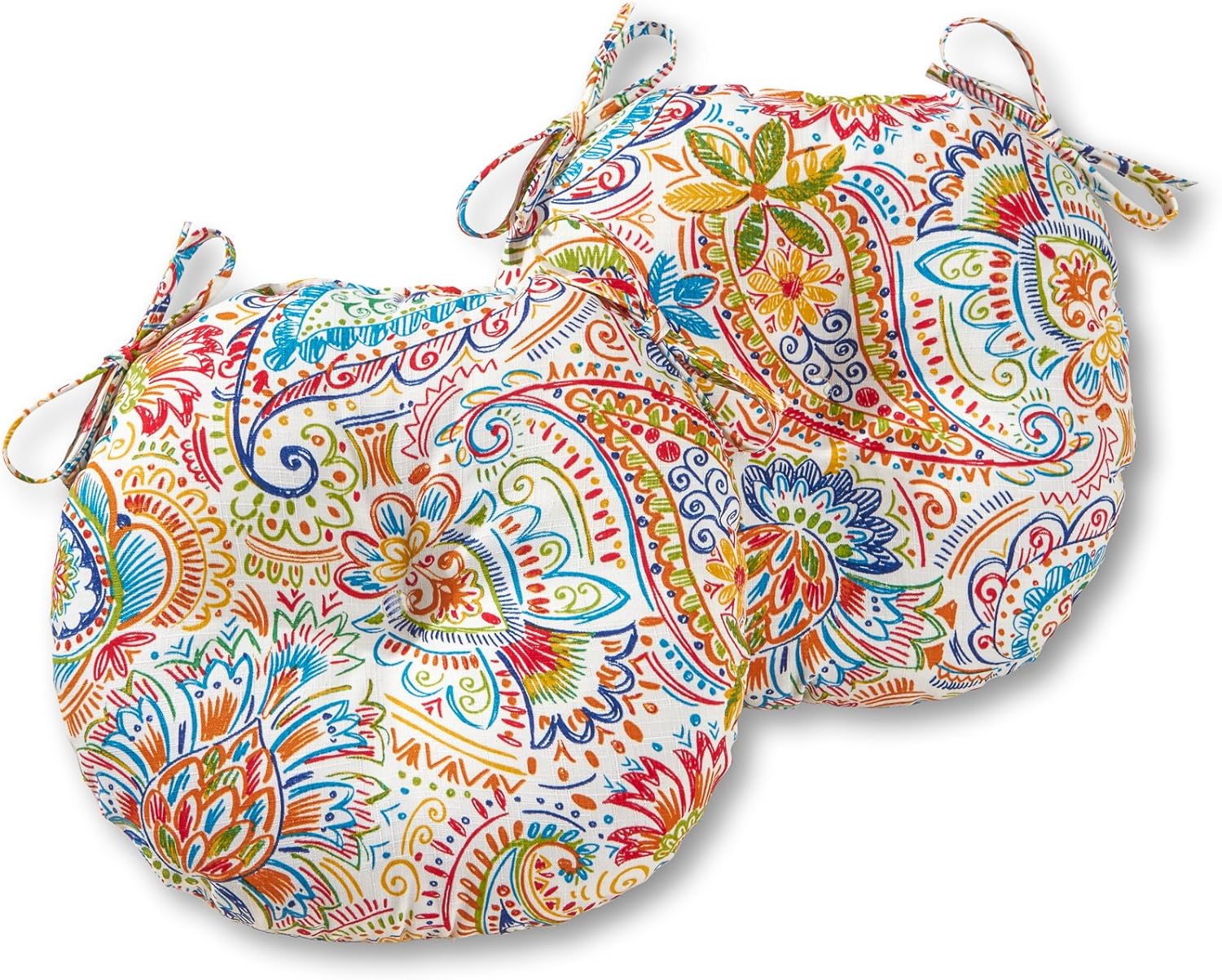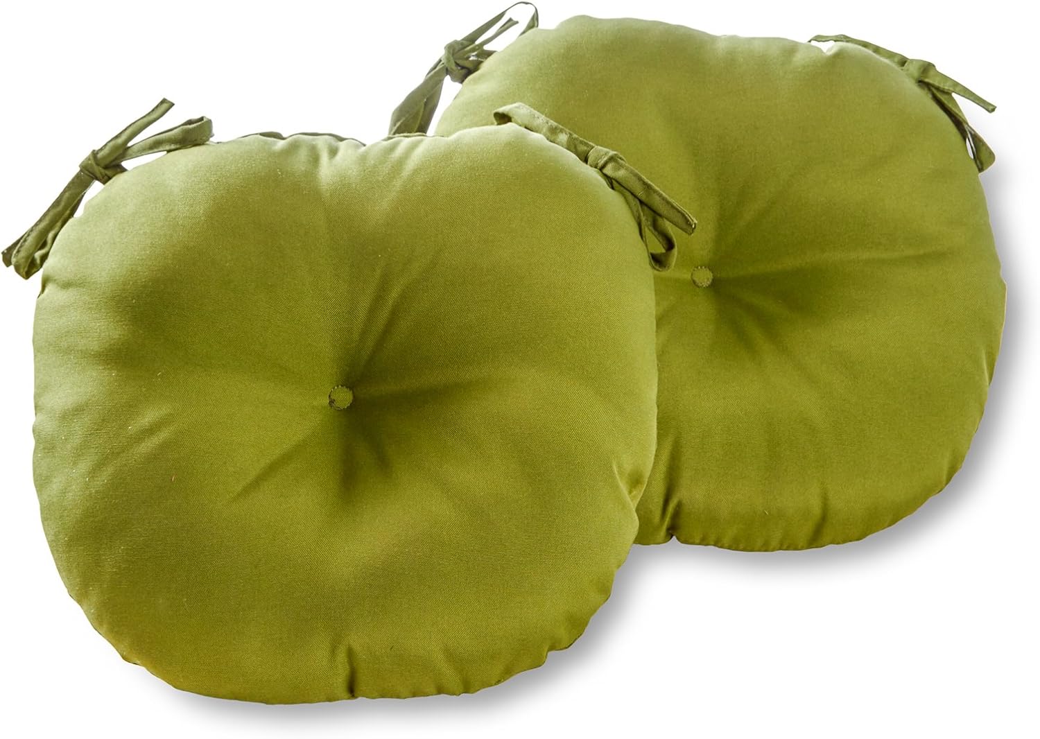 Add a bit of comfort and style to your outdoor bistro set with these Bistro Cushions from Greendale Home Fashions. Cushions feature a center circle tack which prevent fill from shifting and bunching, and two string ties to keep cushions firmly secured to chairs. Each set includes two 15-inch round chair cushions covered in a durable outdoor polyester fabric that holds up to the outdoor elements so your cushions stay looking great. The cushion's soft poly fiber fill is made from 100% recycled, post-consumer plastic bottles, and overstuffed for added comfort, strength and durability. A variety of colors and prints are available to enhance your outdoor decor.Please measure your cushions before purchase to ensure a proper fit.Please Note: Cushion dimensions can be +/- 2 inches. Product will arrive in a slightly compressed state; please allow a few days for product to expand to final size listed in description.In an effort to reduce waste, your cushions will arrive in a recyclable box with no additional plastic waste.For best results, and to extend the life of your cushions we recommend storing them covered when not in use.