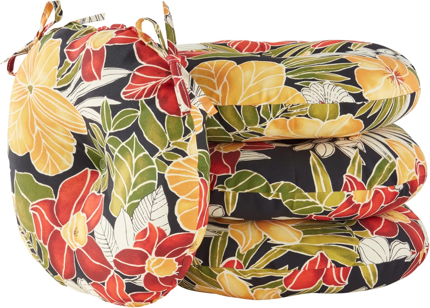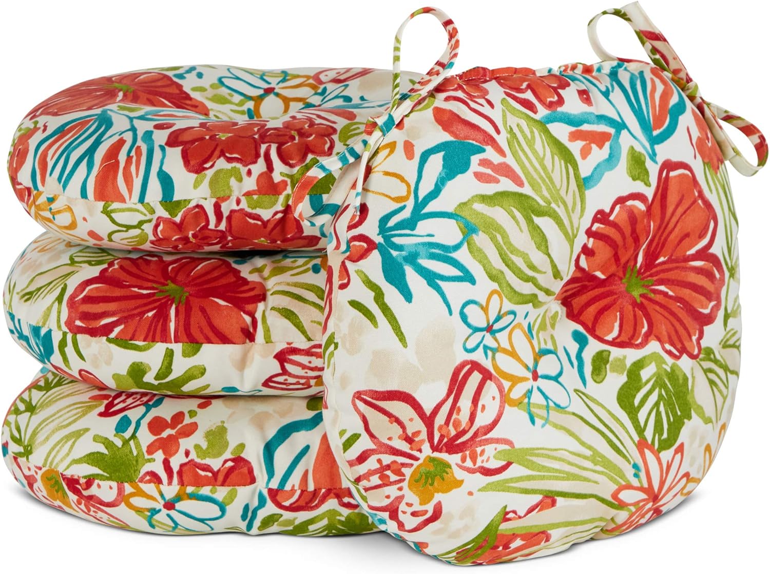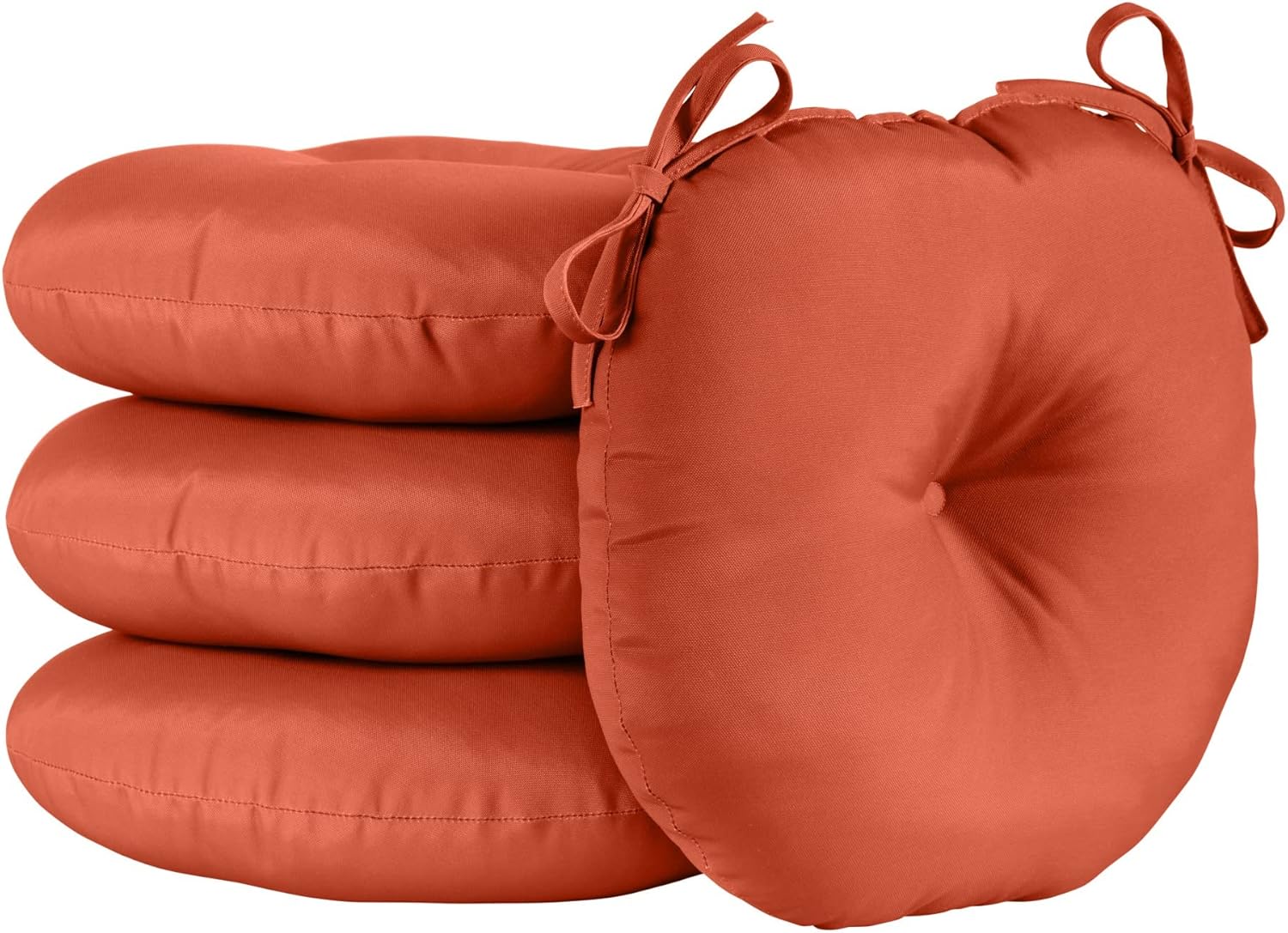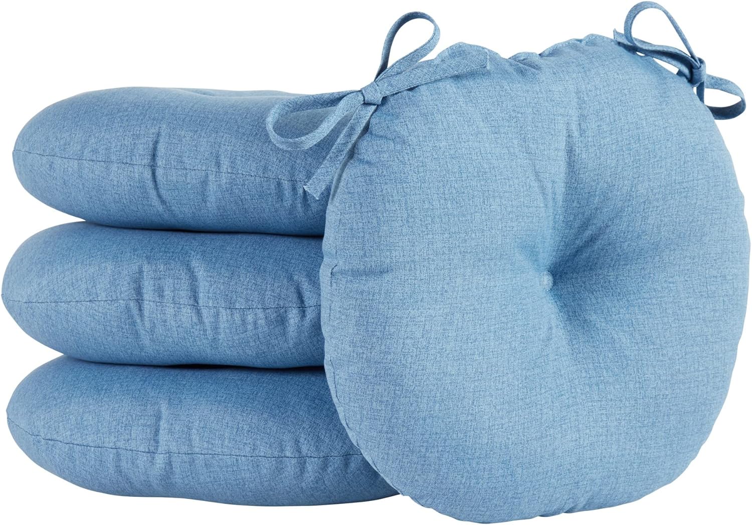 Add a bit of comfort and style to your outdoor bistro set with these Bistro Cushions from Greendale Home Fashions. Cushions feature a center circle tack which prevent fill from shifting and bunching, and two string ties to keep cushions firmly secured to chairs. Each set includes two 15-inch round chair cushions covered in a durable outdoor polyester fabric that holds up to the outdoor elements so your cushions stay looking great. The cushion's soft poly fiber fill is made from 100% recycled, post-consumer plastic bottles, and overstuffed for added comfort, strength and durability. A variety of colors and prints are available to enhance your outdoor decor.Please measure your cushions before purchase to ensure a proper fit.Please Note: Cushion dimensions can be +/- 2 inches. Product will arrive in a slightly compressed state; please allow a few days for product to expand to final size listed in description.In an effort to reduce waste, your cushions will arrive in a recyclable box with no additional plastic waste.For best results, and to extend the life of your cushions we recommend storing them covered when not in use.