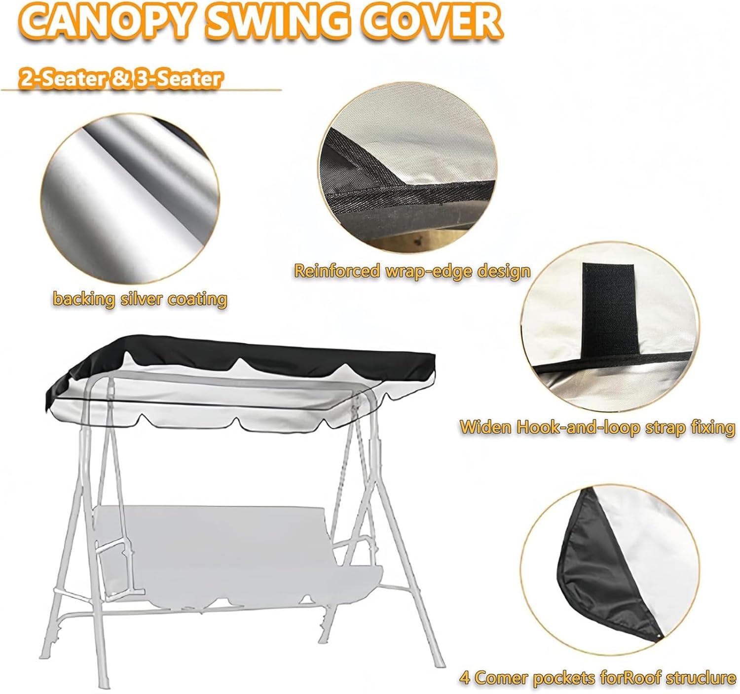 MATERIAL: 420D rip-stop Oxford cloth+Silver coated inner layer for UV protectionFEATURES: seams fully hemmed design, wider nylon hook and loop fixing, four corners fixing design!3 SIZES TO CHOOSE FROM:64.5L x 45.2W x 5.9H inch (64 x 115 x 15cm);74.8L x 45.2W x 5.9H inch (190 x 115 x 15cm);78.7L x 47.2W x 5.9H inch (200 x 120 x 15cm)Content Contains:1*Swing top cover1*storage bag【Note】:Please note that this product is a replacement canopy only and does not include the swing chair frame or cushions.Not only is it waterproof, but it's also fade-resistant and tear-resistant, making it ideal for all weather conditions.