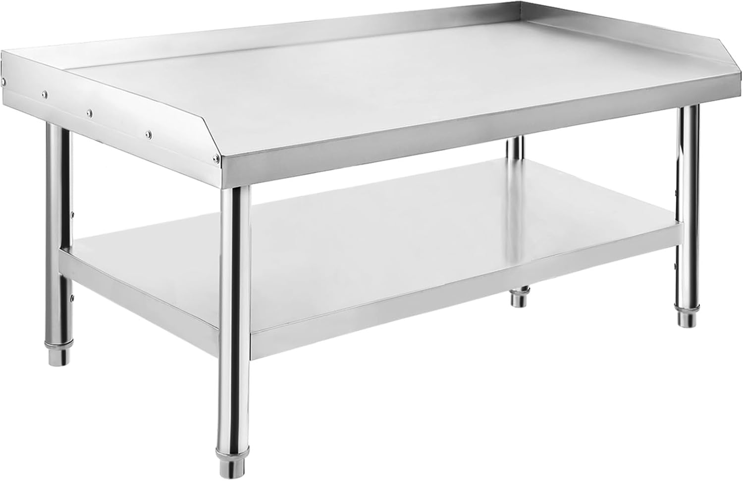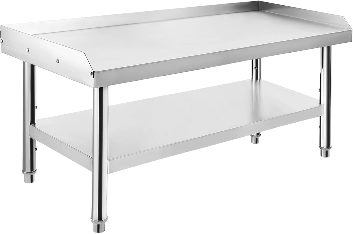 Heavy-Duty Stainless Steel: Exceptional durability and corrosion resistance.Impressive Weight Capacity: Top shelf 1000 lbs; bottom shelf 220 lbs.Adjustable Stability: Adjustable legs and 2" edge baffle for uneven floors.Quick Assembly: All hardware and instructions included.Versatile Use: Ideal for hotels, homes, and commercial kitchens.