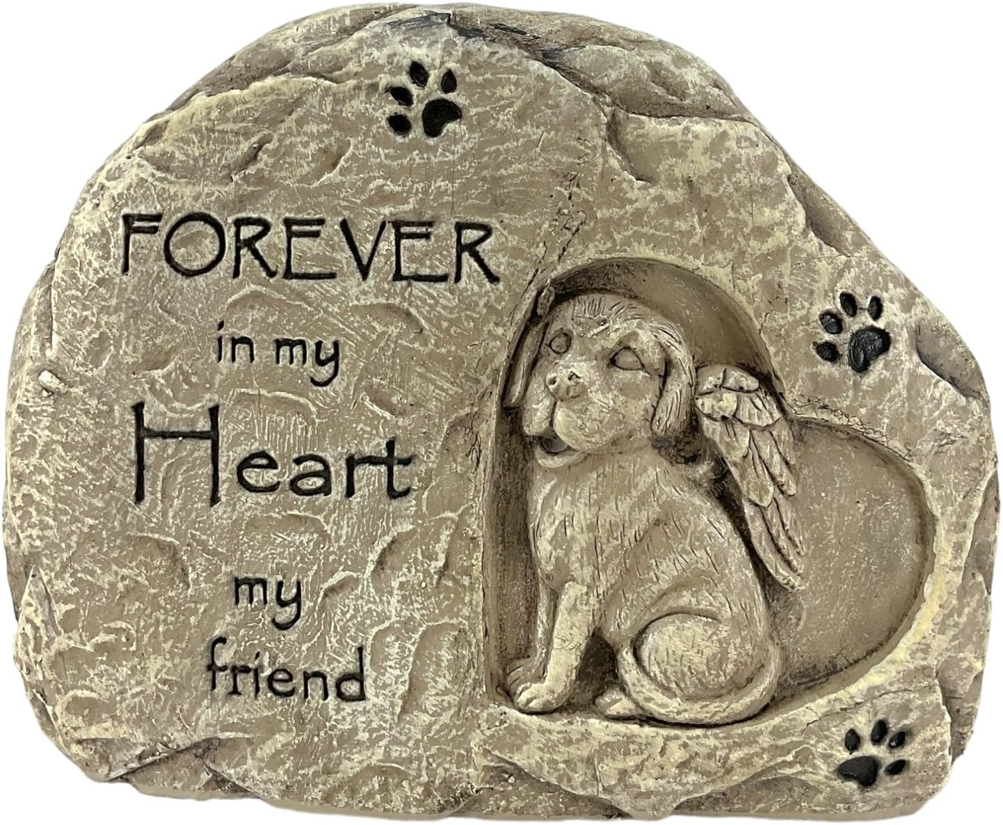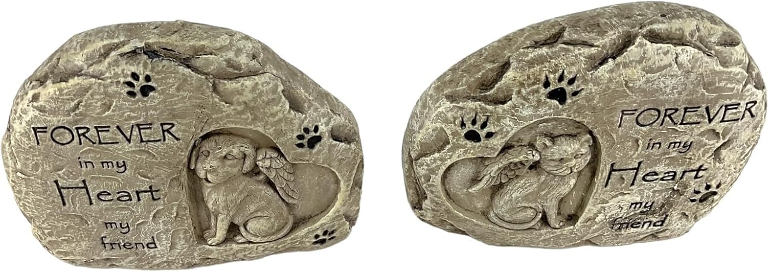 Cat & Dog Memorial Garden Stone. 2 Piece Set. Made of Cement. 4.5 Inch Height x 5.5 Inch Length x 2 Inch Wide. Stones read “Forever in my Heart, My Friend”.