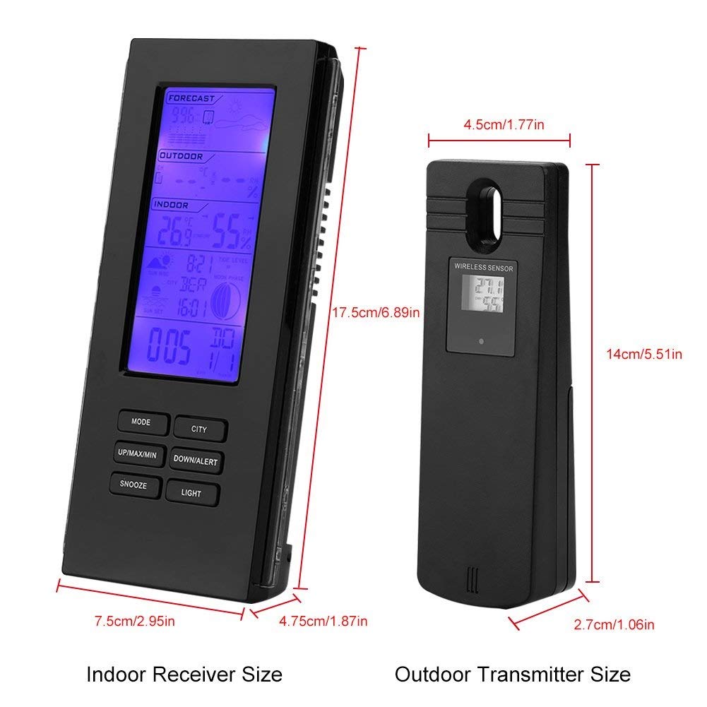 Description:This multi-functional weather station provides indoor & outdoor humidity and temperature measurement, also has weather forecast and alarm clock function. Definitely it will be a good helper for your daily life.Specifications:Condition: Material: Color: BlackDisplay: with backlightIndoor Temperature Measurement: 0~50℃ / 32~122℉Outdoor Temperature Measurement: -20~60℃ / -20~140℉Humidity Measure Range: 20-95% RHAir Pressure Range: 800~1100mb, resolution: 1mbTransmission Range: within 30 metersTransmitter battery: 2 * 1.5V AAA battery (not included)Receiver battery: 3 * 1.5V AAA battery (not included)Indoor Receiver Size: approx. 75* 47.5 * 175mm Outdoor Transmitter Size: approx. 45* 27 * 140mm Weight: approx. 280gPackage Included:1 x Indoor Receiver1 x Outdoor Transmitter(battery not included)Note:1. Please allow 0-2cm error due to manual measurement. Thanks for your understanding.2. Monitors are not calibrated same, item color displayed in photos may be showing slightly different from the real object. Please take the real as standard.
