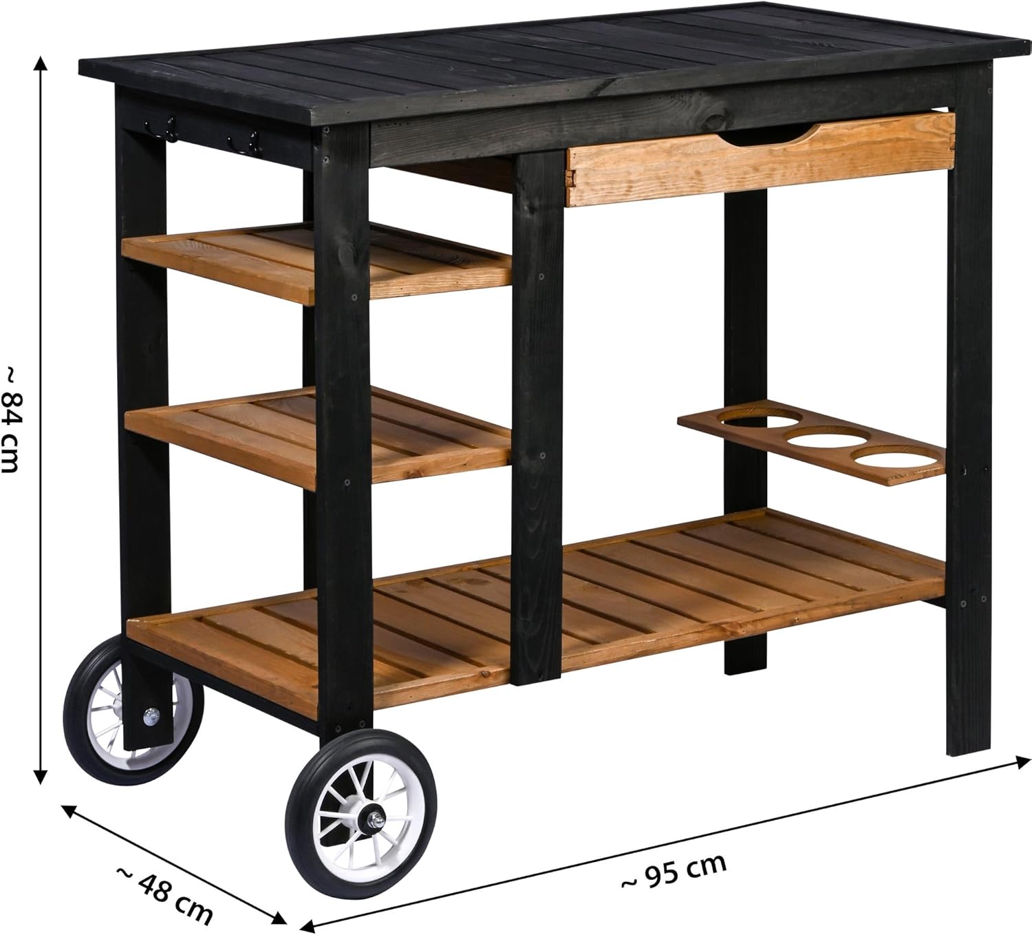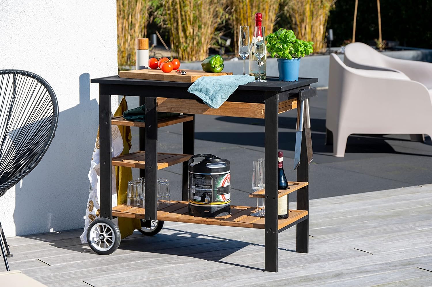 What could be better than spending a warm summer day with family and friends outside at a barbecue? Whether at a large garden party or in a small round, this versatile BBQ trolley is always ready as a practical helper. Our FSC certified pine serving trolley is the ideal choice for all grill masters who want to present their delicacies in a stylish and practical way. The serving trolley has two durable rubber tyres that ensure easy movement on any surface. With the large table top, the base and 2 shelves, it offers plenty of space for dishes, spices and everything you need for a successful barbecue. In addition, the side trolley also has a bottle holder for three large bottles. The pine serving trolley is not only functional, but with its two-tone glazing extremely aesthetic and will certainly be an eye-catcher in your garden or on your patio. This wooden serving cart is not only ideal for outdoor barbecues, but can also be used indoors as a bar cart or as an extra storage space in the kitchen. Its FSC certification ensures that the wood comes from sustainable forestry and is therefore an environmentally conscious product. The outer dimensions of the BBQ trolley are approx. 95 x 48 x 84 cm (L x W x H).