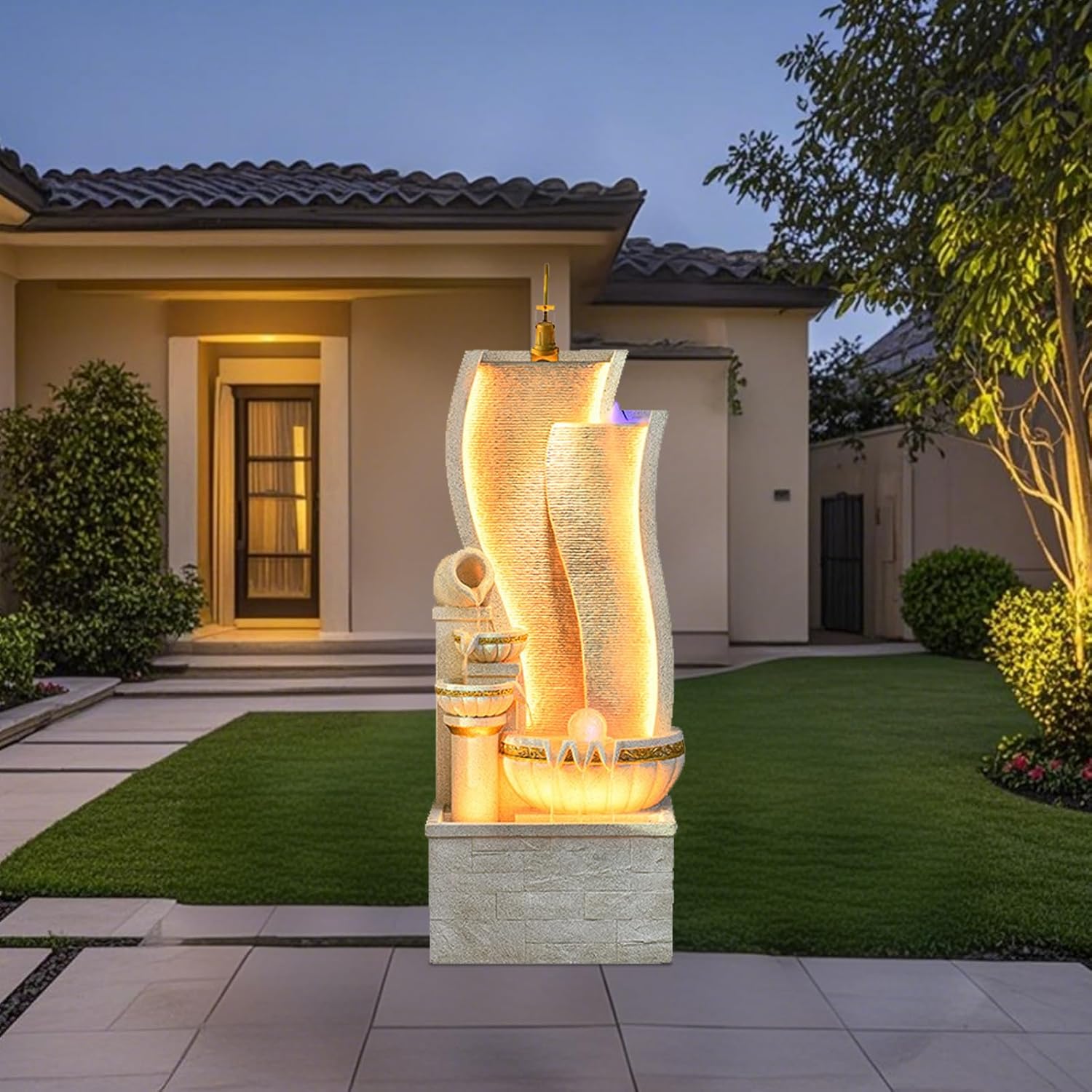 Bring peace and elegance to your home or garden with this sculptural resin water fountain. Designed with a flowing wave structure and integrated lighting, this lightweight water feature combines the calming sound of running water with a glowing mist effect. The layered bowl cascade and spinning crystal ball add motion and charm, while the cobblestone base provides natural texture. Ideal for indoor spaces like foyers, spas, and lounges, or as a serene centerpiece outdoors. Made from durable resin for easier relocation and reduced shipping weight, without compromising visual impact.