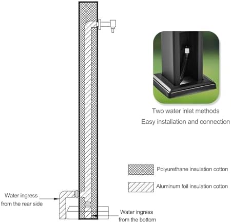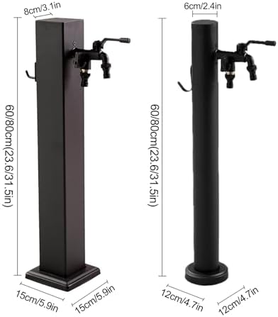 ——This faucet blends beautifully with any garden decor, and makes watering your garden or gardening a breeze, A hose holder is included to prevent curling, kinking, and tangling of hoses, enhancing ease of use ——Designed for versatility, this outdoor water column with faucet features dual water inlets—choose between a side or bottom connection to suit your setup. 【Features】 >The water column is equipped with aluminum foil insulation cotton inside to prevent freezing and sun exposure >The sturdy base firmly fixes the water column to the ground without tilting >Double faucet design, easy to connect to the water source, can be used as a fire hydrant at any time *Product name: Outdoor vertical water column faucet *Product material: 304 stainless steel *Color: black * technology: Manual spraying process *Installation method: side water inlet, bottom water inlet *Scope of application: Suitable for villas, courtyards, lawns, gardening, schools, parks, workshops, etc. *Type: Square tube/round tube
