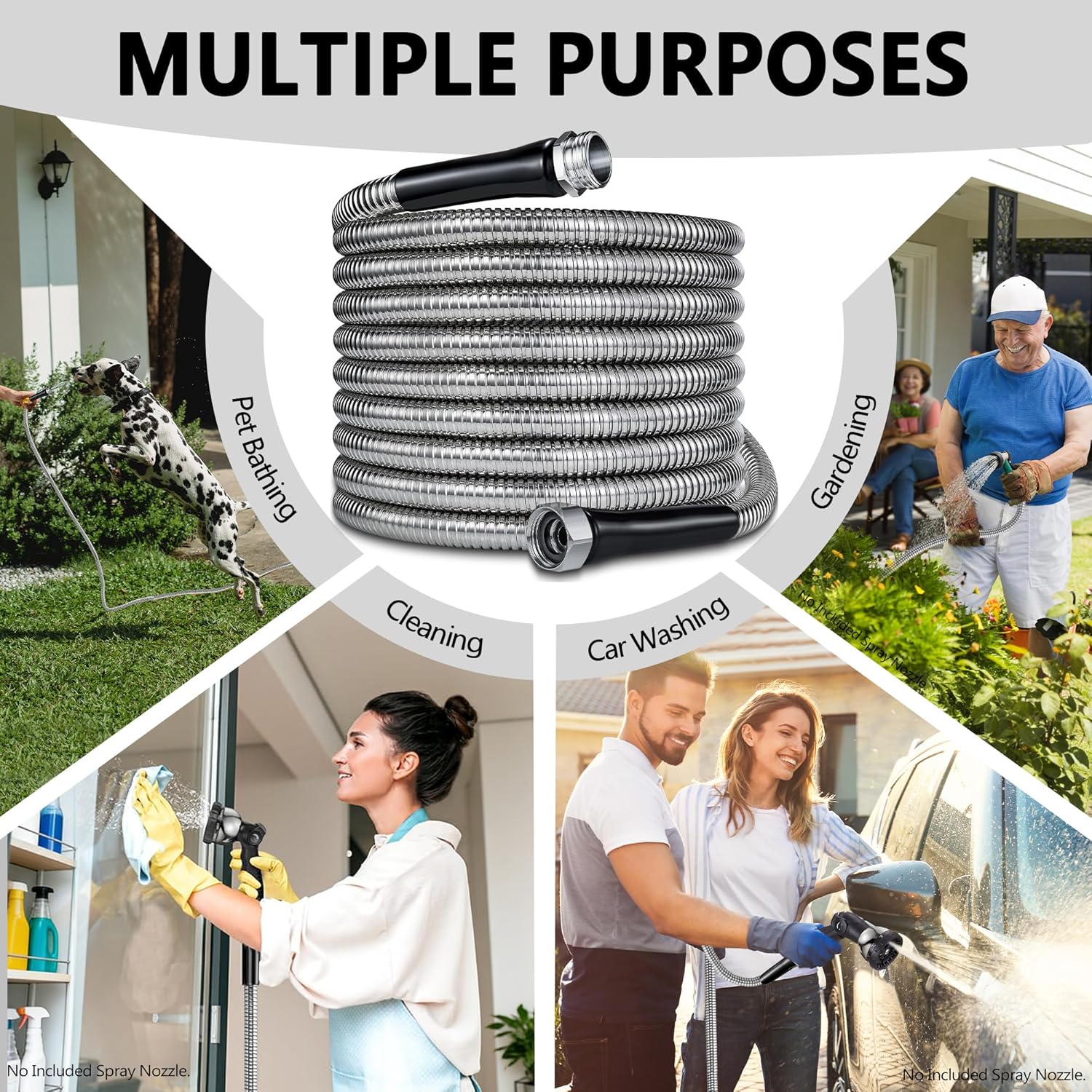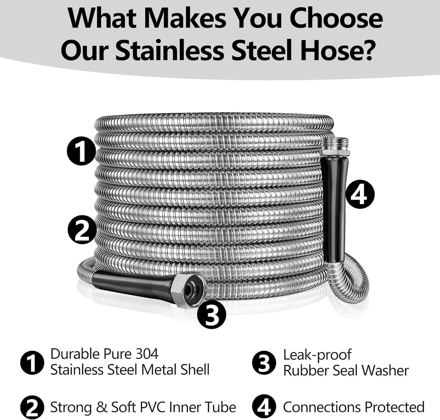 Tired of flimsy, leaky, and kink-prone garden hoses that need frequent replacement? Say goodbye to the frustration of tangled hoses, wasted water, and short service lives with our Upgraded Metal Garden Hose—built to handle all your outdoor watering and cleaning needs, year after year.Why Choose Our Stainless Steel Garden Hose?Corrosion-Resistant: Built with 304 stainless steel and aluminum alloy connectors, it resists rust, UV damage, and harsh weather.Temperature Flexibility: Stays flexible from -40°F to 150°F, ensuring smooth performance in all climates.Leak-Free Sealing: aluminum alloy fittings create an airtight seal, handling high water pressure without leaks.Specifications:Length: 75 feetOuter Tube Diameter: 5/8 inchInner Tube Diameter: 3/8 inchConnectors: aluminum alloy(3/4 inch)Construction: Braided stainless steel outer + durable PVC coreTemperature Range: -40°F to +150°FWorking Pressure: 200 PSIBurst Pressure: 600 PSIIncluded:1 x 75-Foot Garden Hose3 x Spare Washers1 x Seal TapeVersatile Uses:Gardening: Provides steady water flow for plants and lawns.Car Washing: Handles high-pressure rinsing for quick cleaning.Home Cleaning: Cleans decks, windows, and driveways effortlessly.Pet Baths: Includes nozzles for gentle spray options.Friendly Reminder:When the hose is fully extended for use, please do not close the nozzle for a long time, as excessive water pressure may damage the hose or fittings.When the hose is not in use, please empty the water inside in a timely manner, especially in cold weather (to prevent freezing damage) and hot weather (to extend service life).Upgrade today for a hassle-free outdoor experience.