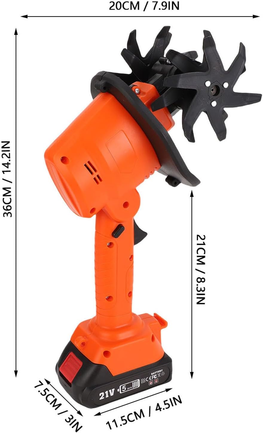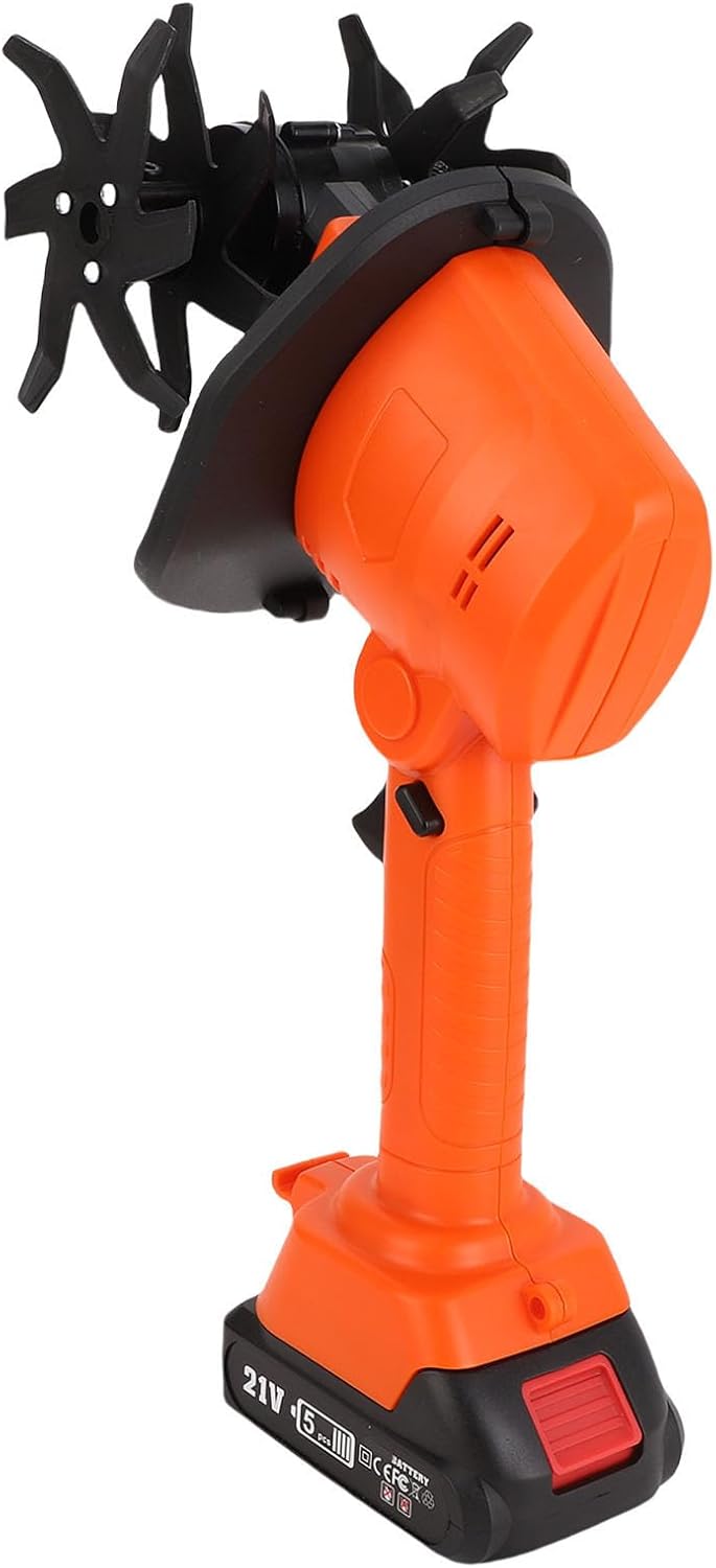 Powerful 235RPM Tilling with Manganese Steel Tines: Features an upgraded copper motor and four durable manganese steel tines for efficient soil penetration and robust tilling performance. Lightweight and Ergonomic One Handed Design: Weighing only 2.6 lbs with a foldable handle, this cultivator offers an ergonomic design for effortless one handed operation during gardening tasks. Long Lasting 1.5Ah Battery with Quick Charges: Equipped with a built in 1.5Ah battery providing up to one hour of run time, and it rapidly recharges in 80 minutes for continuous gardening use. Enhanced Safety with Dual Protection System: Includes a triggers lock button, safety start switch, and a protective guard that automatically stops rotation upon detecting obstacles for secure operation. Versatile for Various Gardening Applications: This handheld cultivator efficiently handles tasks like loosening soil, weeding, and trenching, making it suitable for lawns, greenhouses, and outdoor land projects. Spec: Item Type: Cordless Tiller Cultivator Material: ABS, Manganese Steel Battery: 1x1500mAh Rechargeable Battery (with Matching Battery Included) How to Use: Take out the product and install it, then it can be used. packing list: 1 x Cultivator 2 x Guard Parts 2 x Screws 2 x Cultivator Blades 1 x Battery 1 x Adapter 1 x Screwdrivers Bit 1 x Special Wrench 1 x Instruction Manual