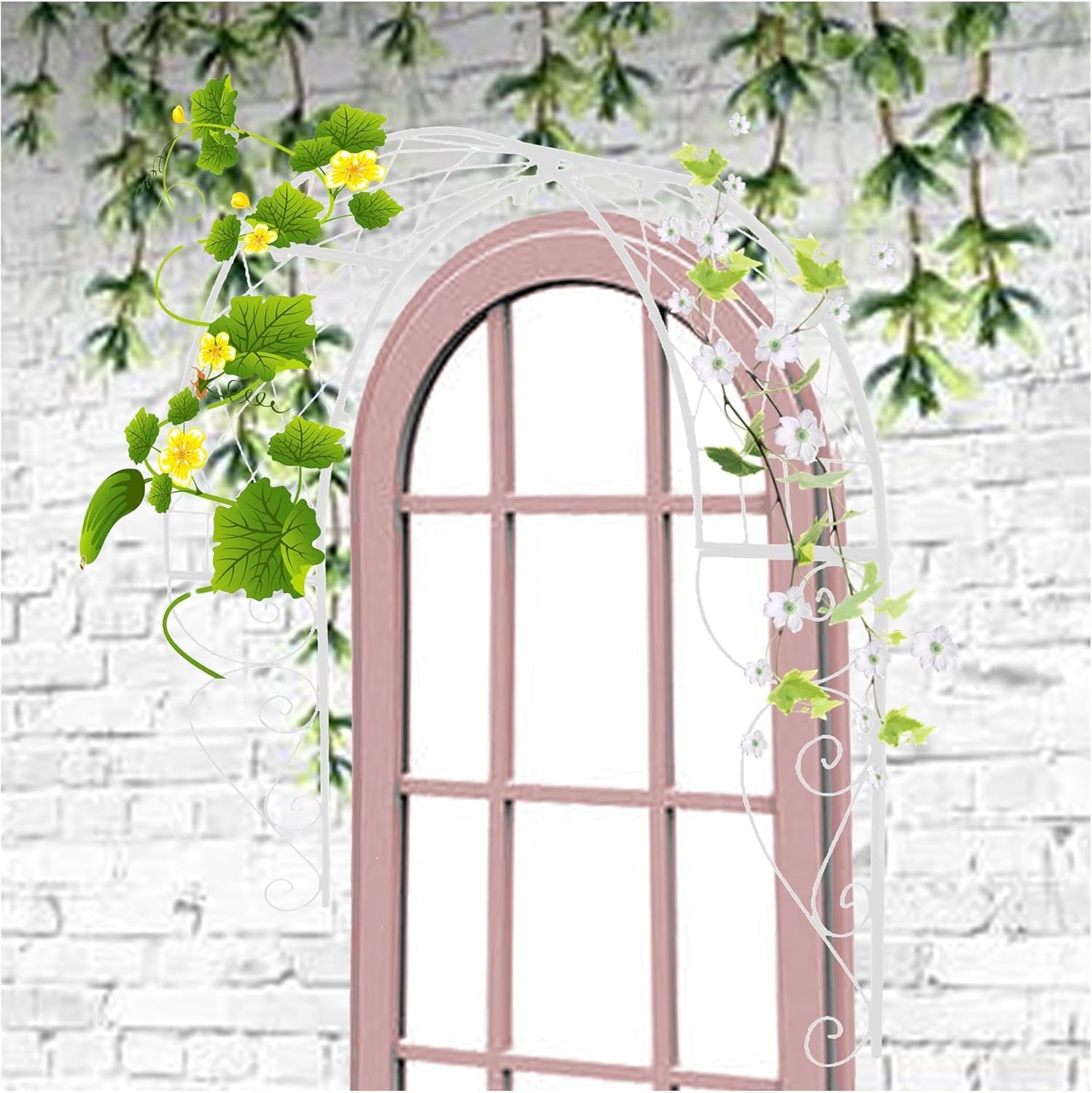Metal garden trellis for climbing plants outdoor Wall Mounted Garden Arbor Arch A wonderful way to decorate your garden and yardMetal garden trellis for climbing plants outdoor can be used as a window or door eave during the summer months, offering protection from the elements while adding a decorative touch to your home.The round top garden arch is perfect for supporting lightweight climbing plants and vines or for displaying small hanging accents. Plant trellis outdoor can easily transform your garden into a colorful display with various flowers. Moreover, the garden arch is strong enough with its sturdy steel frame to support several hanging items even with their fruits, such gourds, beans, raspberries etc.Package Contents:1x Garden Arch1x Screw Kit▲Note:1.Due to differences in lighting and screens, the product color may vary slightly from the picture.2.Product measurements are taken manually. Please allow for slight errors and refer to the actual size.3.If you have any questions or concerns, please don't hesitate to contact us. We strive to provide excellent customer service and will respond to your inquiries within 24 hours.