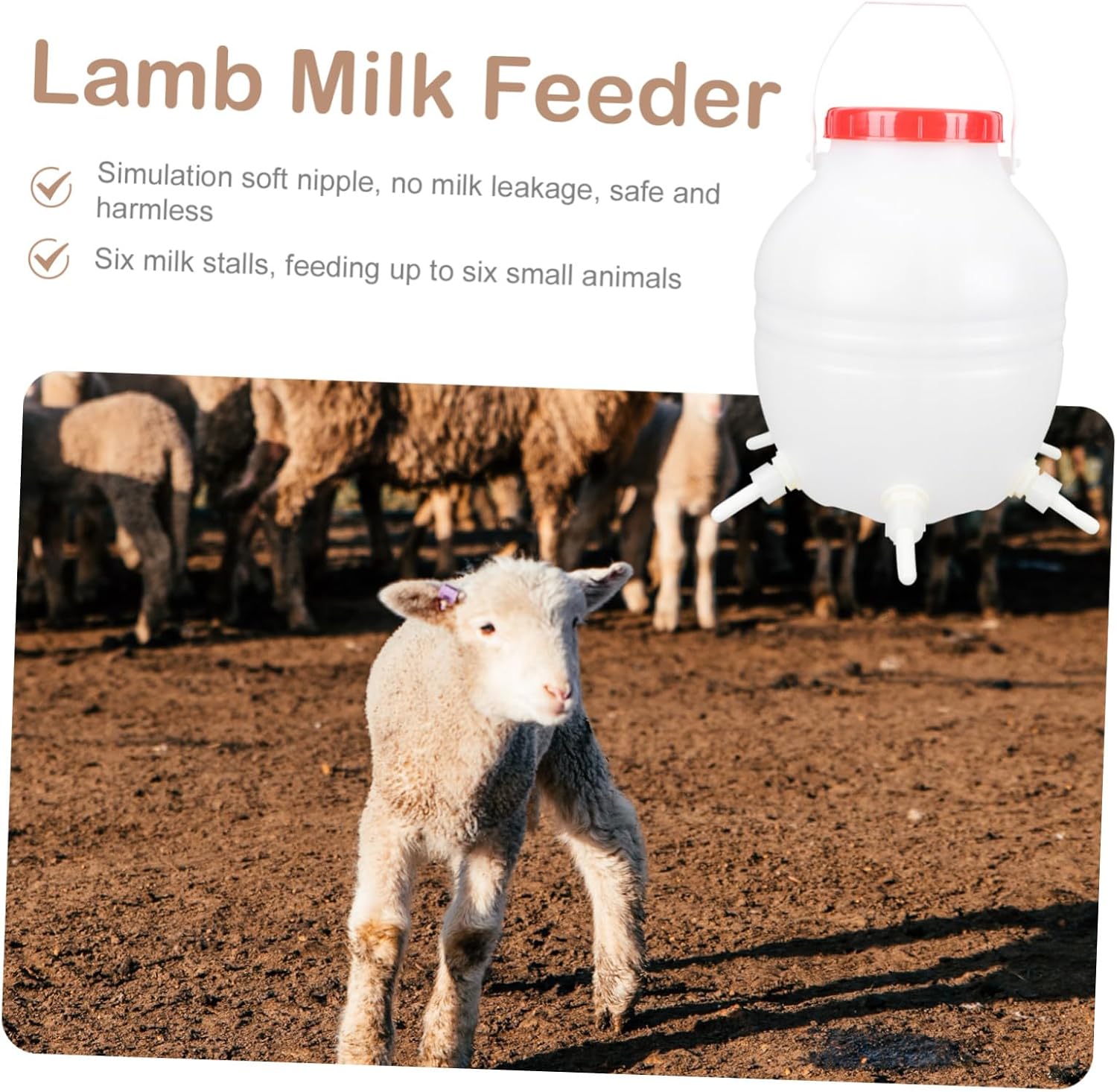 Package Include 1 x Lamb Milk Feeder 6 x nipples Features - Capacity: 8L Lamb Milk Feeder. - Color: Assorted Color Lamb Feeder. - Material: Plastic + soft silicone lamb bottle feeder. - Size: About 32.00X23.00X23.00cm/12.58X9.04X9.04in lamb feeder with nipples. - Fine workmanship and texture, a gadget for farmers, farm owner, etc lamb feeder bucket. - The feeding bottle is made of for and use lamb feeding bucket. - Suitable for young livestock feeding, such as piglet, lamb, young calf, etc sheep feeding bottles. - pacifier with toughness, which is and wear-resistant sheep feeder. - Large 8L capacity, which can greatly meet your feeding needs goat feeding bottles.Goods Descriptionlamb feeder bucket This item is a young livestock feeding milk bottle, which is made of for and use.lamb nursing bottle with strong toughness, specially designed for young livestock feeding, such as young pig, lamb, young calf, etc