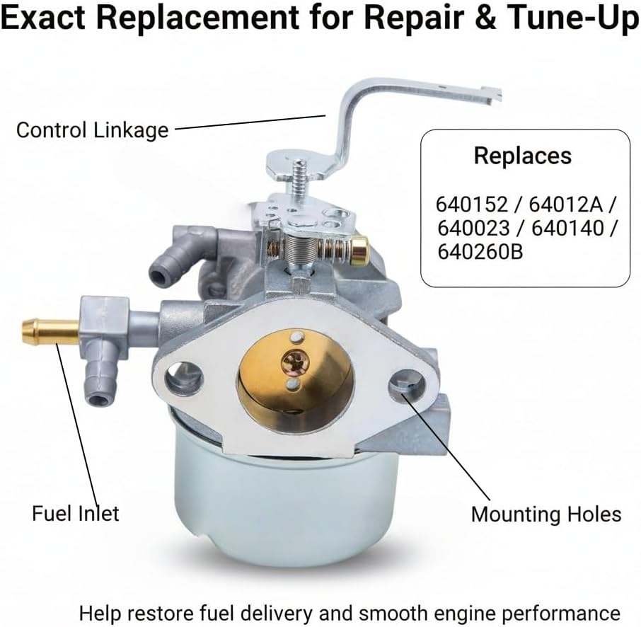 This carburetor is intended for repair and routine maintenance ofSnow removal machine, generator. It is used to replace worn, clogged, or unstable carburetor assemblies and help restore starting, idling, and fuel delivery. Before purchase and installation, compare the compatible models (640152, 640152A, 640023, 640051, 640140, 640260B), replacement numbers (640152, 640152A, 640023, 640051, 640140, 640260B), and key fit details such as choke/linkage style, mounting holes, fuel inlet direction, and included parts. Brand and model references are used only for compatibility identification.