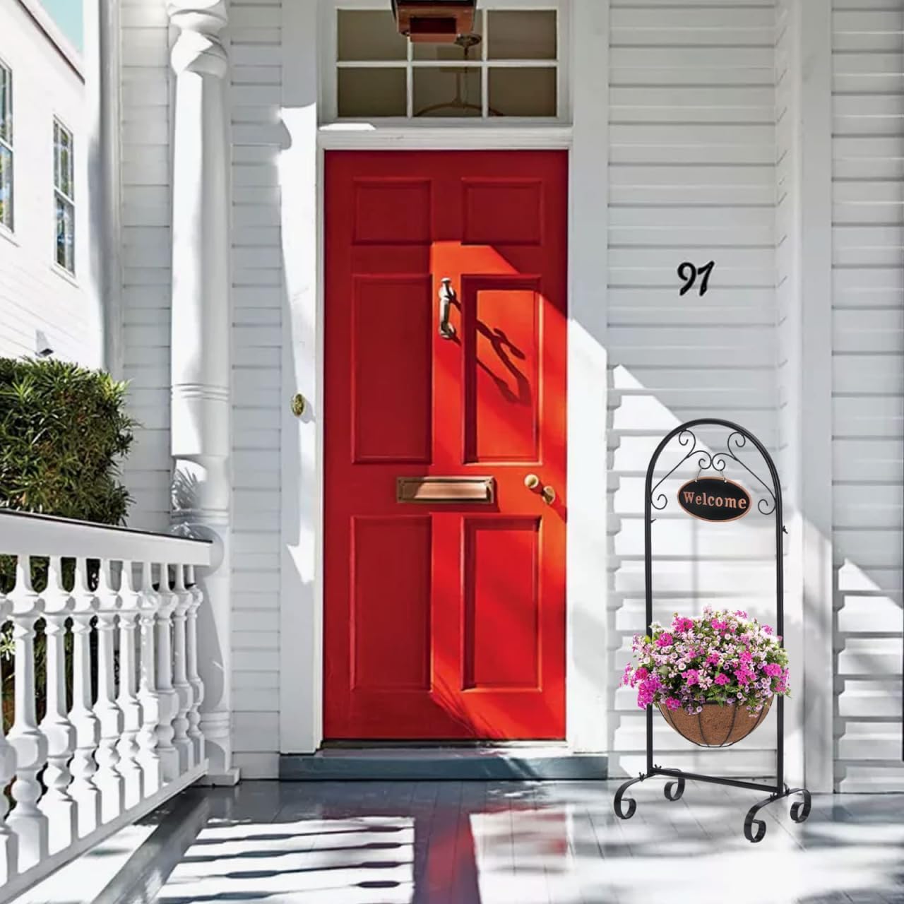 Features a classic black metal frame adorned with intricate decorative scrollwork, topped with a stylish "Welcome" sign. Its clear font and color contrast create a charming, inviting focal point that instantly enhances your home's entryway or garden. Crafted from high-quality, powder-coated metal, this hanger offers exceptional resistance to rust, corrosion, and fading. It confidently withstands various weather conditions, ensuring long-lasting beauty and reliable performance in your garden or home for years to come. Standing at a versatile 39.5 inches tall, it's ideally proportioned to beautifully showcase your favorite flowers, lush herbs, or trailing greenery, without overwhelming or cluttering your valuable patio, balcony, or windowsill space. Perfectly suited for both indoor and outdoor settings. Use it to add a touch of rustic elegance to your porch, patio, or balcony, or bring natural charm indoors to brighten up your kitchen, living room, or even a home office corner. Designed for a hassle-free setup. It comes with clear instructions and all necessary hardware, allowing for a quick and simple assembly with no complicated tools required. You'll be enjoying your beautiful hanging basket in just minutes.