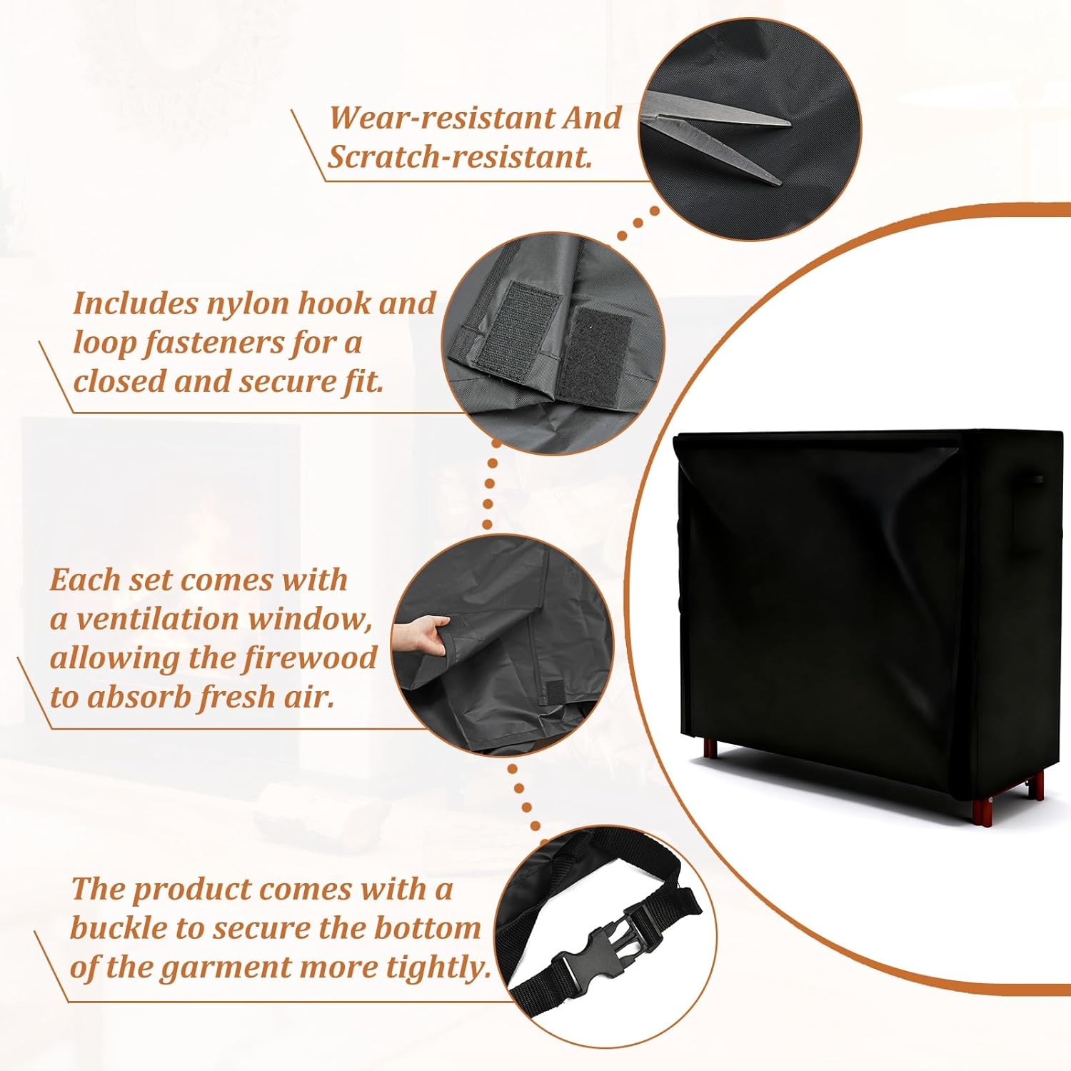 Features:1.Full Size Cover: The firewood cover is suitable for 4ft long log racks up to 48" L x 24" W. The convenient hook and loop fasteners and sturdy buckles ensure a secure, snug fit that stays in place even in windy conditions. NOTE: Cover Only, the metal firewood rack is NOT included. 2.Premium Material: Crafted from heavy duty 420D fabric, this waterproof wooden cover resists tearing and abrasions. It offers reliable protection for your firewood even in harsh conditions, ensuring long-term dependability for both indoor and outdoor storage. 3.Air Vent Design: This log storage cover features side ventilation windows that work with the bottom air channels to create a circulating airflow. This design effectively reduces the accumulation of water vapor inside the cover, and keep the logs dry even in rainy weather. 4.All-Weather Protection: This cover protects your firewood from rain, snow, dust, leaves, and other outdoor elements all year round. whether you're storing wood for daily fireplace use or through seasonal changes, this cover provides a reliable protective barrier. Specification:Product Size: 121×60×106cm / 48×24×42in Packing Size: 19.5×20×7cm / 7.65×7.87×2.76in Weight: 801.55g / 28.27oz Material: 420D Oxford Fabric Color: Black Package Includes:1×Firewood Log Rack Cover
