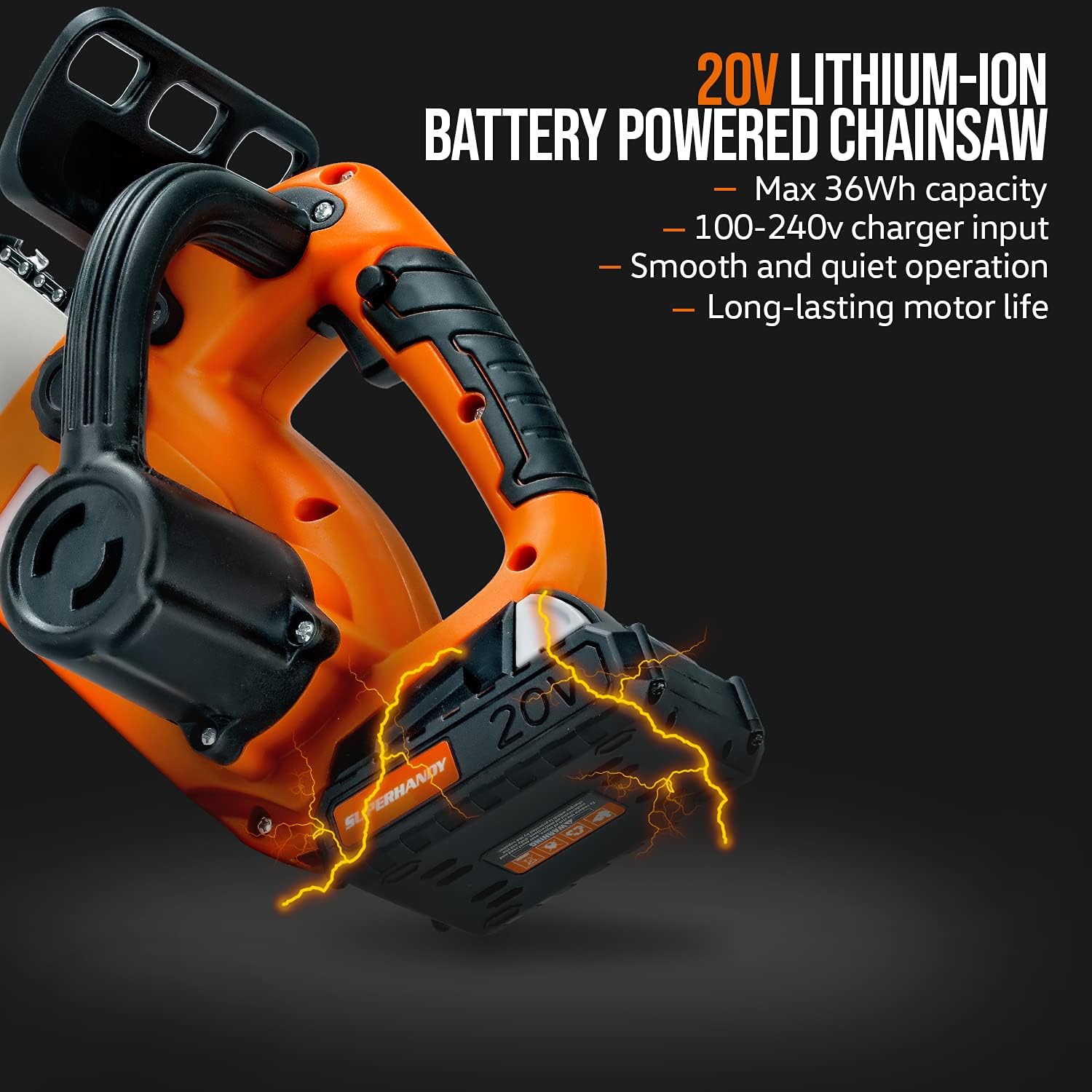 This Mini Handheld All Electric 20V Chainsaw provides an outstanding chain speed of 16 feet/second, cutting length of 7" to 8.5" (inches), with a no load run time of 15 minutes; The tool free chain tensioning and bar tightening knob provides proper bar clamping forceCompact and lightweight design gives maximum user control and comfort; The secure view window allows operator to easily add and check bar oil level at ease; Our high efficiency brushed motor, ensures longer motor lifeECO-FRIENDLY - (Green and Safe), unlike gasoline-powered devices, electric-powered units produce no smog/fumes/emissions and are both gas and exhaust free, while being quieter when compared gas powered unitsOur battery operated Mini Chainsaw will greatly amplify your freedom, our 1,000-Cycle Charging Test assures that each battery is lighter, more powerful, and lasts longer when you compared to other unitsSAFETY - Always operate the Chainsaw with eye and hand protection. This Mini Chainsaw is electric powered and does not require fuel to operate, BEST APPLICATIONS - Outdoor use for gardening, lawn care, forestry wood cutting and landscaping