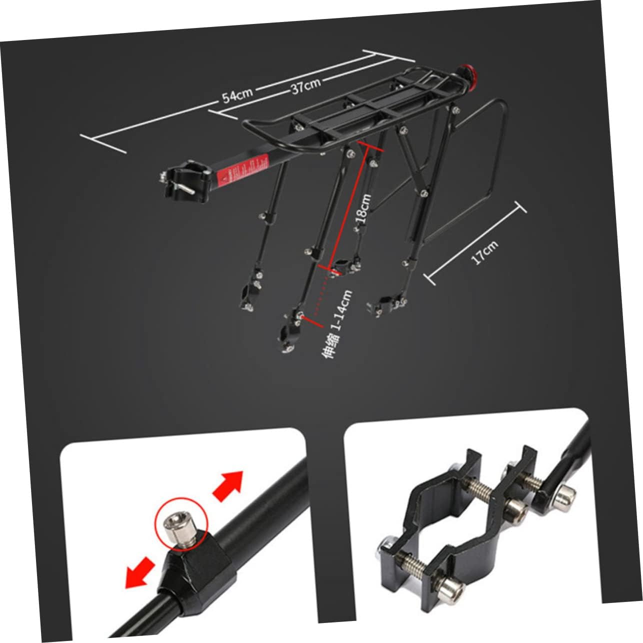 Package List 1 x Bike Rear Rack Features - Material: Aluminum alloy bike shelf accessories. - Size: About 55x14.5x14cm/ 21.65 x 5.71 x 5.51 inches rear racks. - Color: Black. - With reflective light, for riding at night luggage carrier. - Made of material for lasting use bike rear racks. - Quick release design, lightweight and compact, won't add too much weight to your bike bike rear shelf. - Suitable for most bikes, especially for road bike and mountain bike bike carrier rack. - Perfect for holding suitcases, backpacks, so that you can carry lots of things with you and make a convenient short trip.Goods Descriptionrear racks It is to use for suitcases, backpacks, so that you can carry lots of things with you and make a convenient short trip.bike rear shelf This item is manufactured with for and use.bike rear racks aluminum alloy material, the shelf is strong and