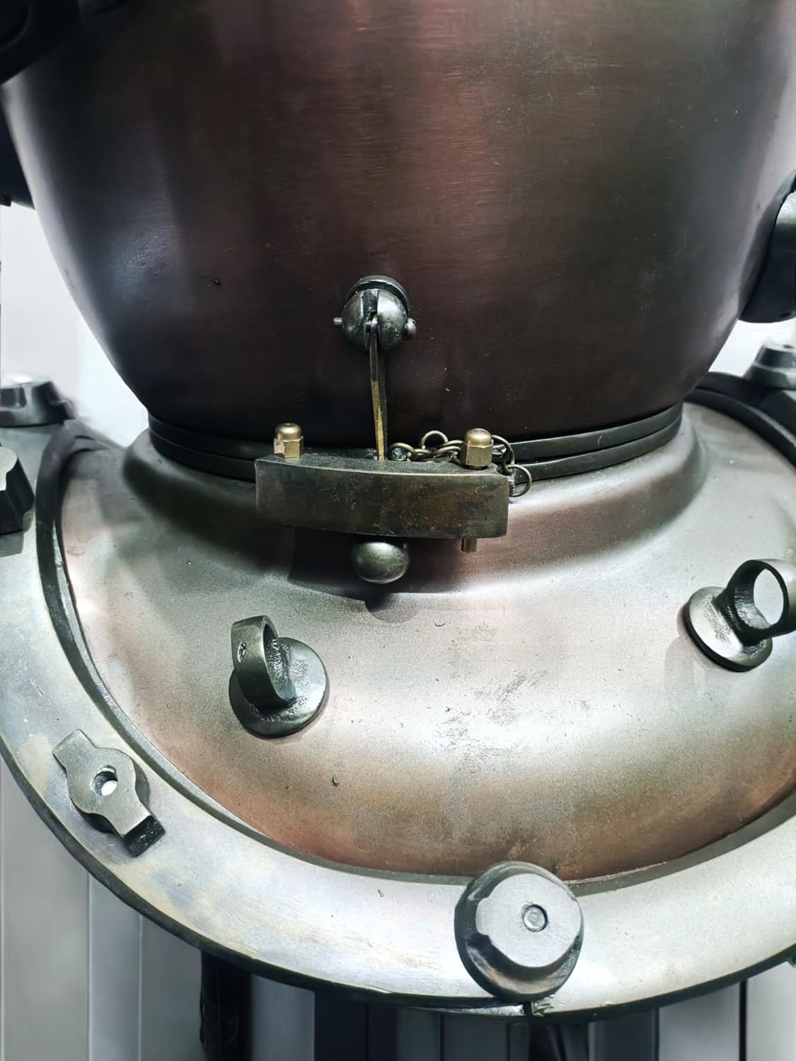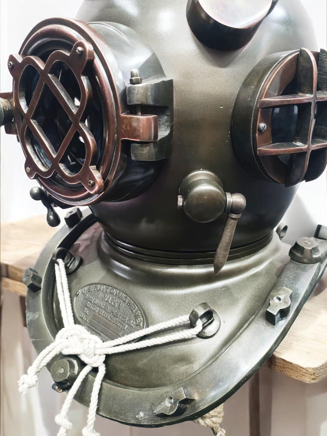 Immerse yourself in the captivating world of vintage diving with this remarkable antique diving helmet. Crafted with meticulous attention to detail, this piece exudes an aura of rugged charm and historical significance. The intricate design features a sturdy metal frame adorned with brass accents, creating a visually striking contrast. The helmet's distinctive copper-colored face mask, with its intricate lattice pattern, invites you to imagine the adventures of deep-sea explorers from bygone eras. Mounted on a sturdy base, this unique decoration piece adds a touch of maritime nostalgia to any room. Whether you're a collector of antiques or simply appreciate the artistry of bygone eras, this diving helmet promises to be a conversation-starting centerpiece that transports you to the depths of maritime history.