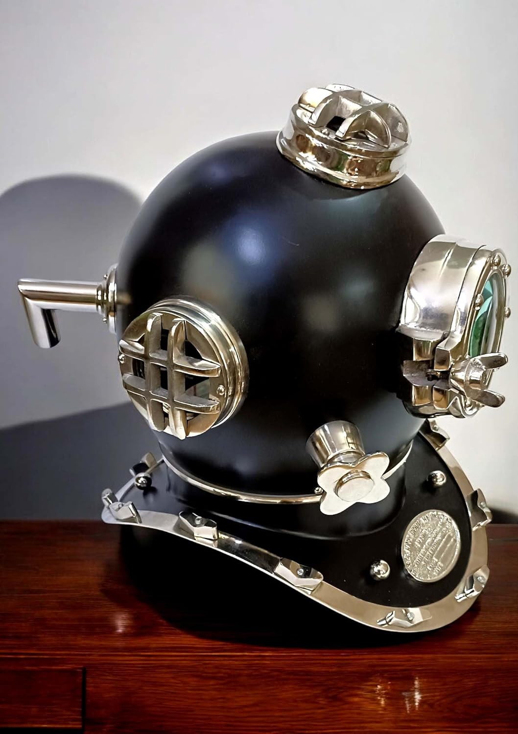 | Model Name | Black & Chrome plated scuba diving helmet with wooden base |