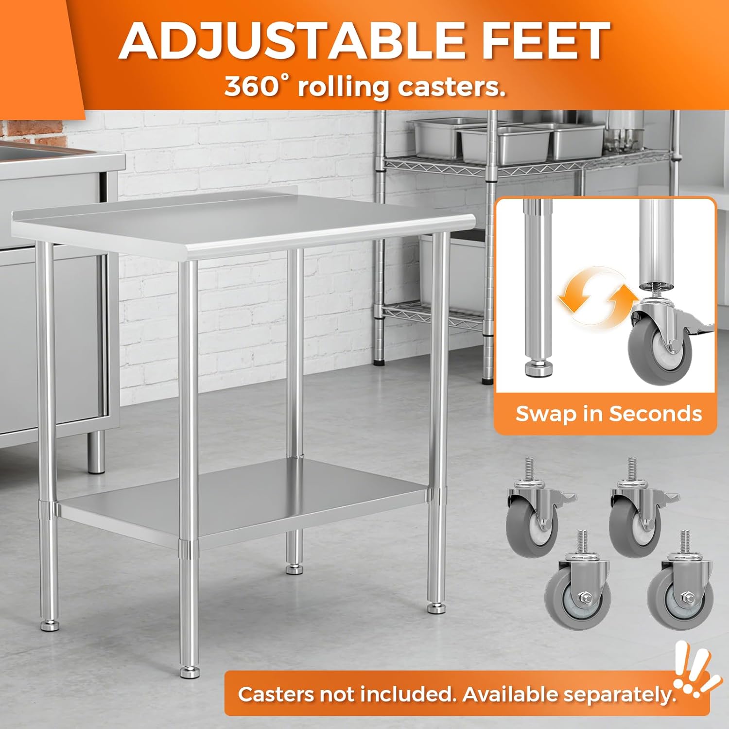 The HOCCOT All Stainless Steel Work Table delivers professional performance for any workspace. Built from durable 430 stainless steel, its load-bearing capacity has been upgraded. Switch between anti-slip feet and casters for stationary or mobile use. Perfect as a heavy-duty prep table for restaurants, food trucks, outdoor kitchens, and garages, this versatile work table combines superior strength with flexible configuration for all your commercial and DIY needs.