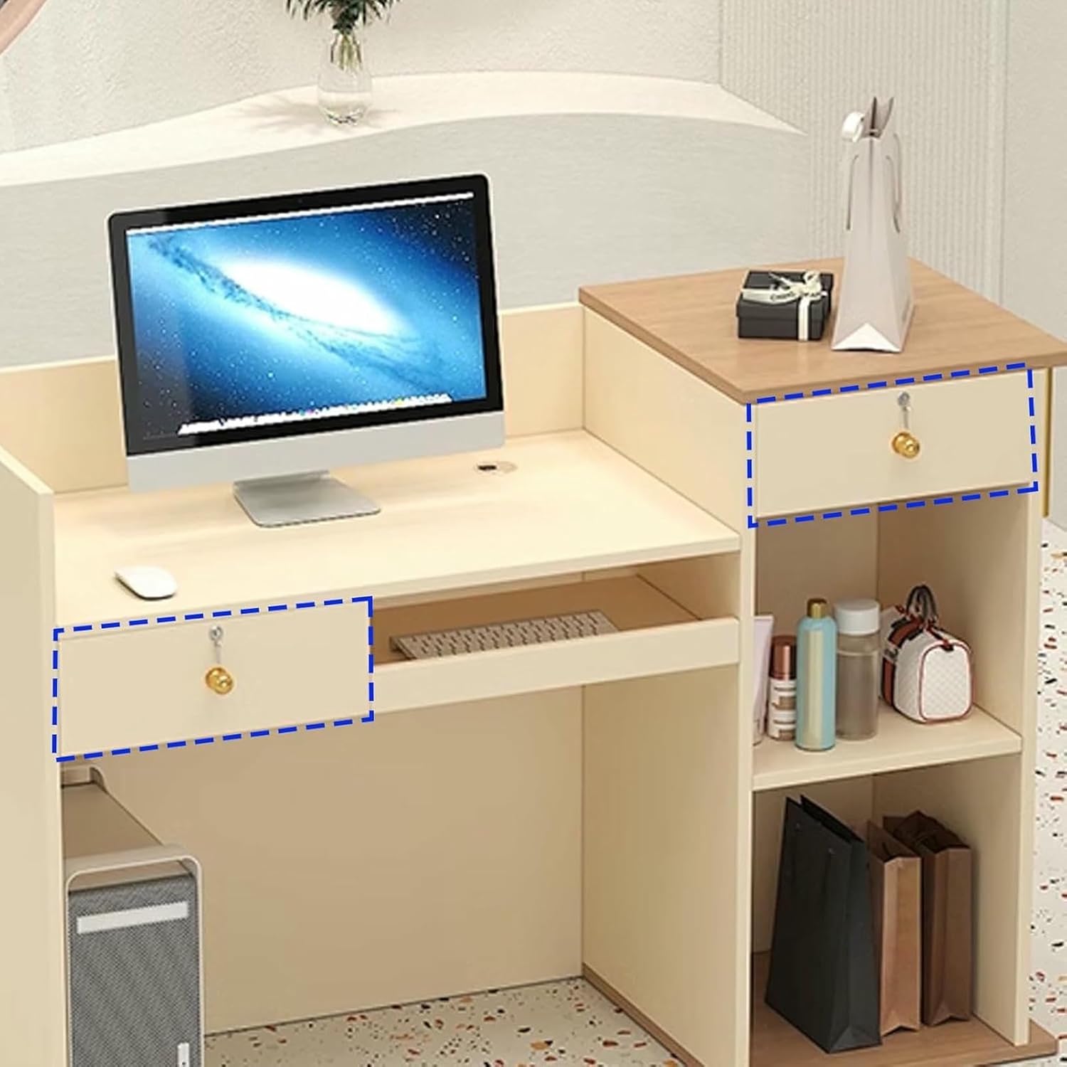 Stainless steel gold plating, shaped bracket, light luxury texture, just right.reception table has drawer storage, large-capacity storage, hiding clutter, storage dust, and protecting privacy.Stylish and beautiful, this reception desk combines simple and stylish lines and geometric shapes to ignite your passion for life.Our front desk is made of high-density fiberboard, which has a sturdy and structure.Specifications:Color: White , White A , Black , Beige , White B , Beige AMaterial: WoodInstallation or not: YesOverall Dimensions: 80/100/120×45×90cm / 31.4/39.3/47.2×17.7×35.4inNote:1. There are only Reception Desk, other products are shooting props;2. Note: Due to the particularity of the furniture, there will be slight errors in the finished product, which is normal. The data is for reference only and must be based on the actual product. We hope for your understanding!3. While we display colors as accurately as possible, due to differences in computer monitors, colors may vary.