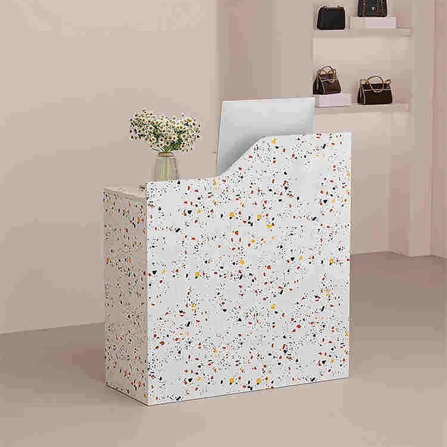 Front Counter Desk Reception Desk Home Office Desk with Lockable Drawers L-Shaped Reception Counter Table Retail Counter Modern Welcome DeskThis front counter desk combines style and practicality, making it an ideal choice for various settings such as lobbies, beauty salons, and corporate offices. The L-shaped design not only maximizes your available space but also offers a modern aesthetic that enhances the overall ambiance of your environment.Crafted with Sturdy materials, this reception desk ensures practical and stability, standing up to the demands of daily use. Its lockable drawers provide secure storage for important documents and personal items, helping you maintain an organized workspace while ensuring that your belongings are safe and easily accessible.Versatile and multi-functional, our reception desk is perfect as a home office desk, accommodating everything from client meetings to everyday tasks. The sleek surface offers ample space for a computer, paperwork, or decorative items, allowing you to personalize your workspace while keeping it professional.Whether you’re welcoming guests in a retail environment or managing appointments in a beauty salon, this modern welcome desk creates a warm and inviting atmosphere. Easy to assemble with user-friendly instructions, you can set it up quickly, allowing you to focus on what matters most—providing exceptional service to your clients.Material: Engineered Wood, MDFFocus on Details for Good ProductsReception DeskHigh-quality Metal RailThe Reception Counter Table has 1 drawers, which are equiped with metal slides. Open and close drawers smoothly.Reception DeskSoft Open & Close HingesHardware is used for the Front Counter Desk to make opening and closing doors quieter and easier.Notice:1. Note: Due to the particularity of the furniture, there will be slight errors in the finished product, which is normal. The data is for refere